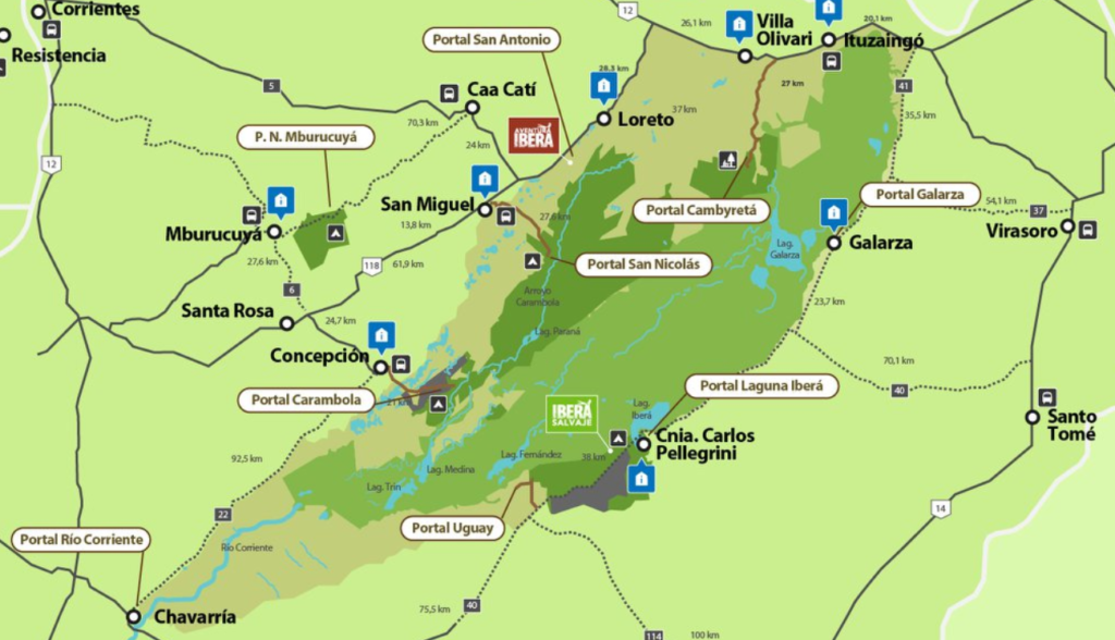 En arrivant par le nord (Corrientes capitale), c’est le premier portail accessible, à moins de prendre la route vers le sud en direction de Carlos Pellegrini, dont la réserve est payante. La piste est excellente malgré la météo compliquée à cette période. Sur la dernière partie, on croisera juste quelques flaques aisément contournables.