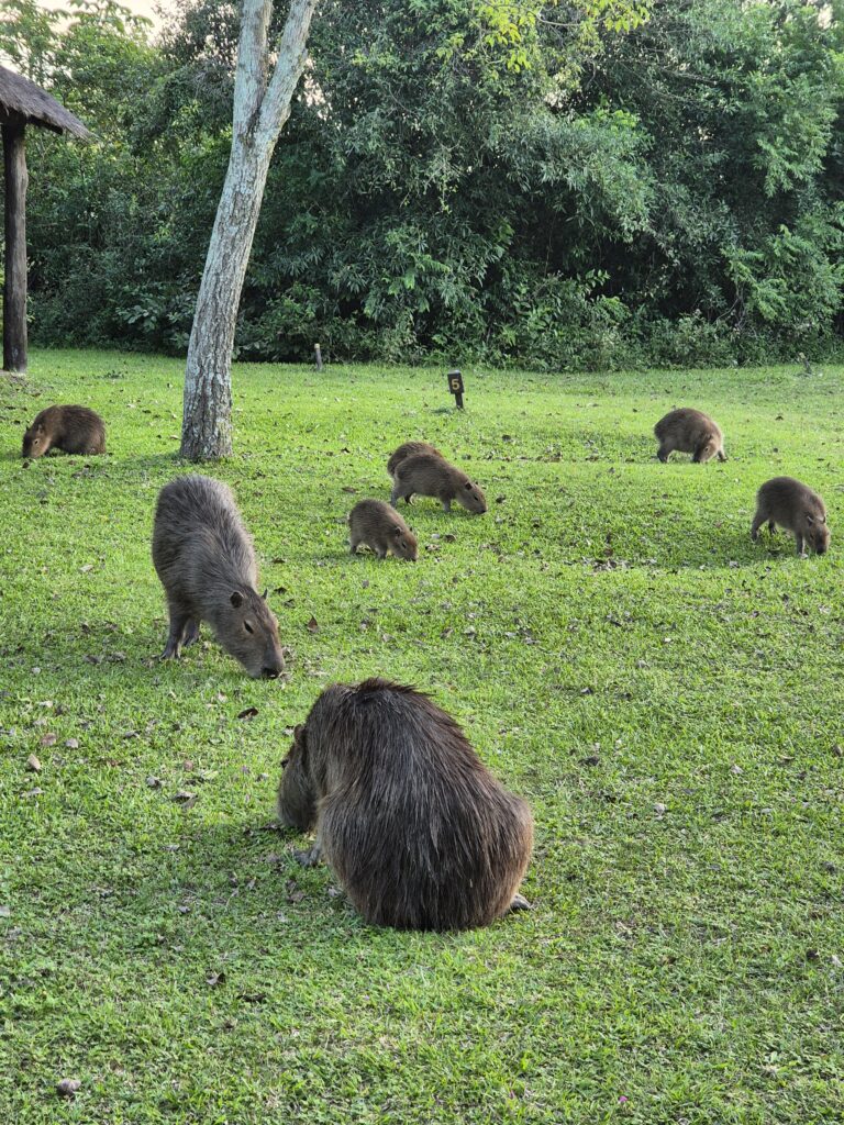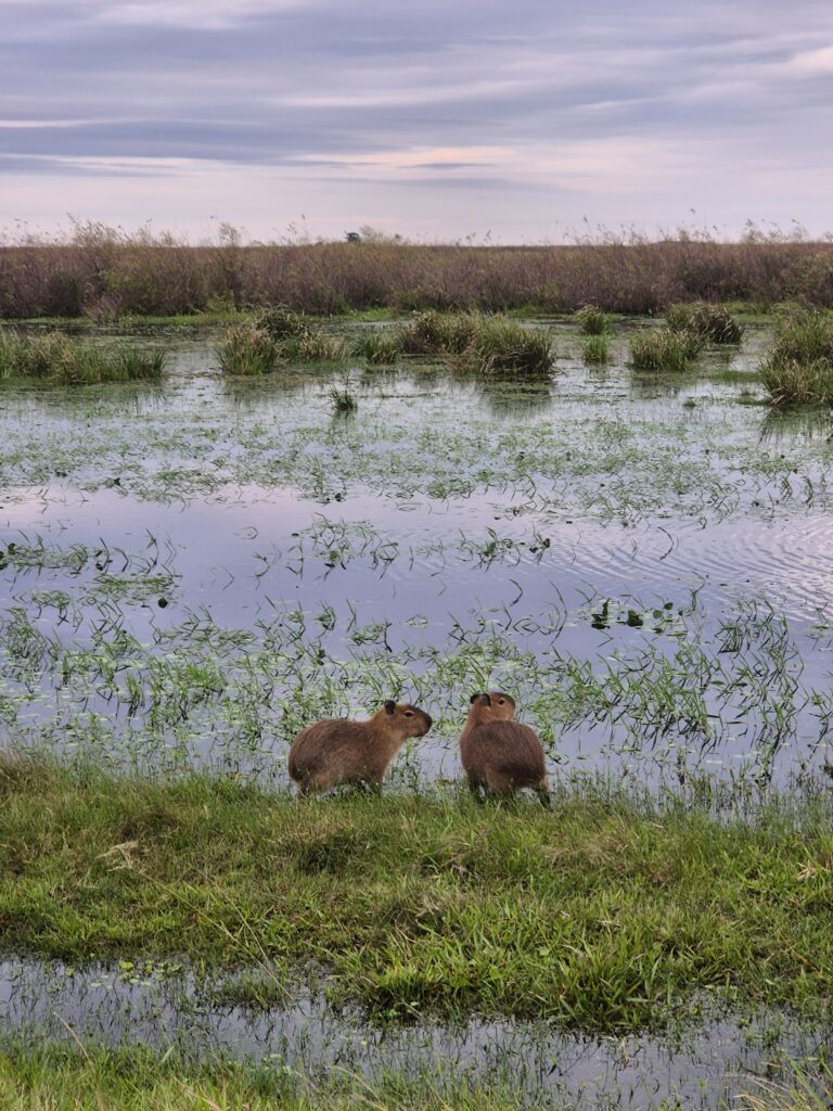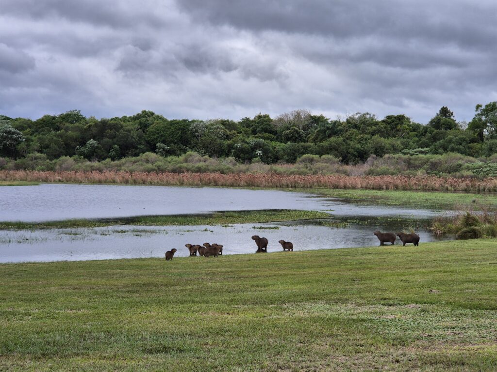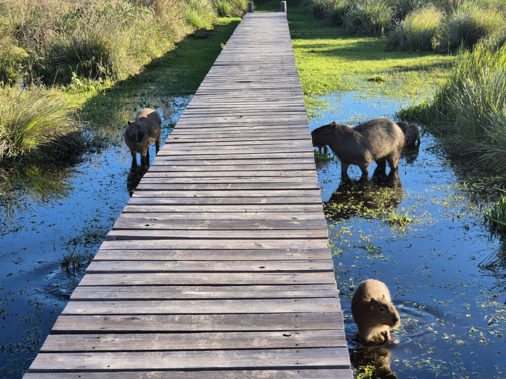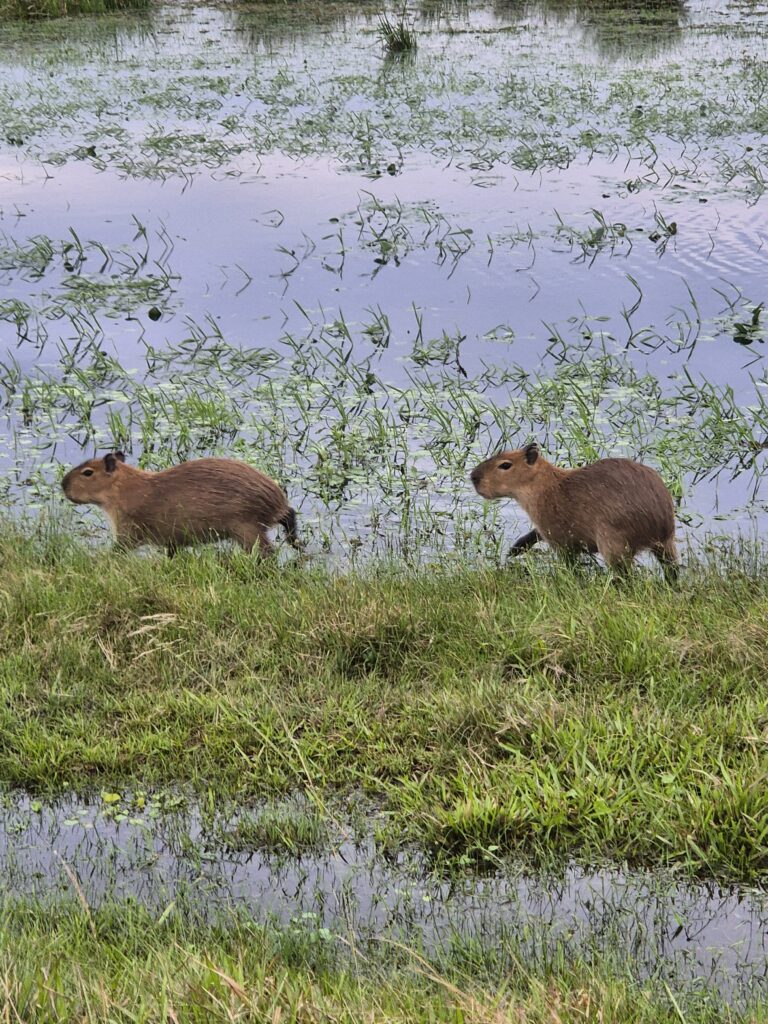 Par où commencer ? Sans doute par les capybaras, présents par centaines… Du matin au soir, on croise ces adorables peluches, tantôt craintives (avec leur petit cri distinctif avant de déguerpir) tantôt parfaitement accommodées de la présence humaine. Ils se baladent en plein milieu des campings.
