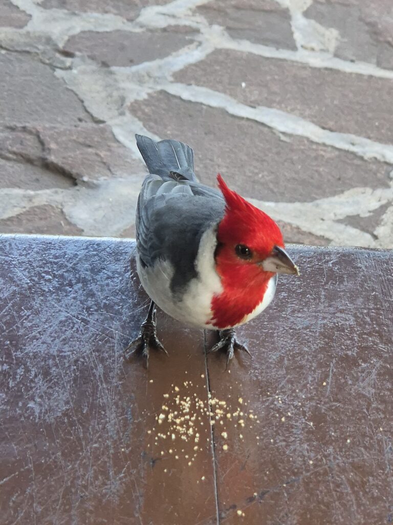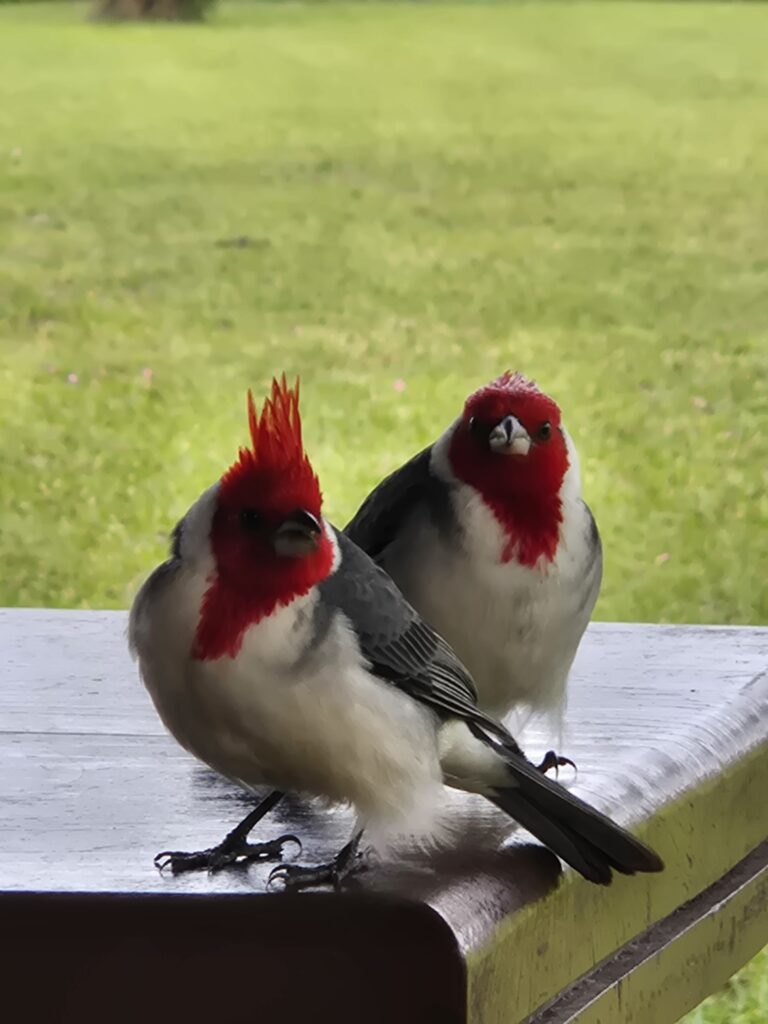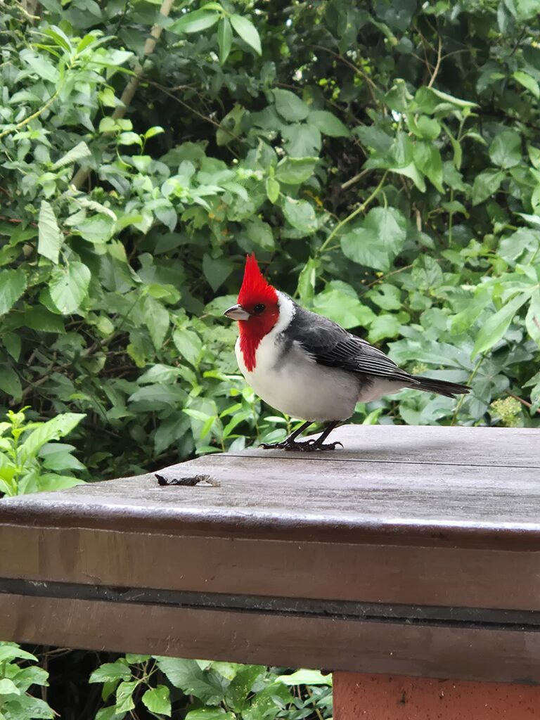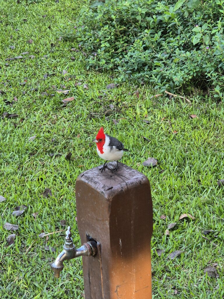 C’est fou, juste assis sous un quincho à préparer le dîner, on aperçoit tantôt des loutres traverser furtivement la pelouse ou des colibris virevolter tandis qu’un capy bronze au soleil à quelques mètres. Nos 2 copains à crête rouge, des paroares huppés, nous tiennent régulièrement compagnie, lorgnant sur les miettes du petit-déjeuner.