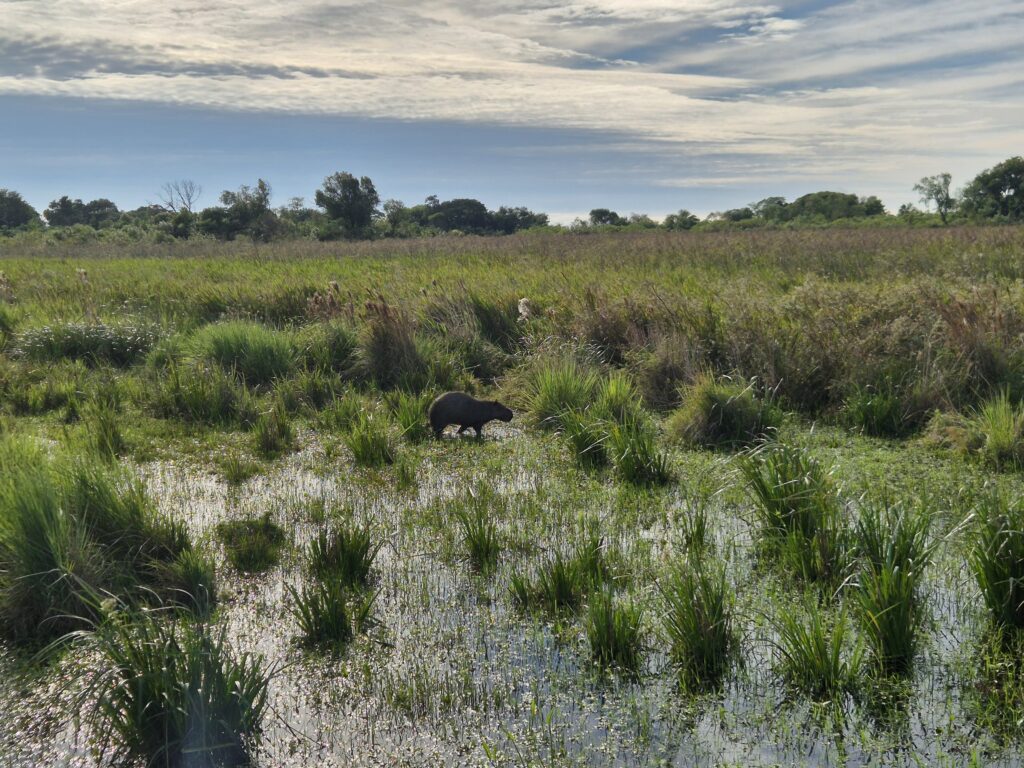 On roule sur une bande de terre, longeant de vastes champs et déjà quelques marécages où on aperçoit rapidement des capybaras, les plus gros rongeurs au monde. On en avait déjà aperçu en Amazonie bolivienne, mais c’est la première fois qu’on les voit de si près et en si grand nombre. John est ravi, on dirait des grosses peluches.