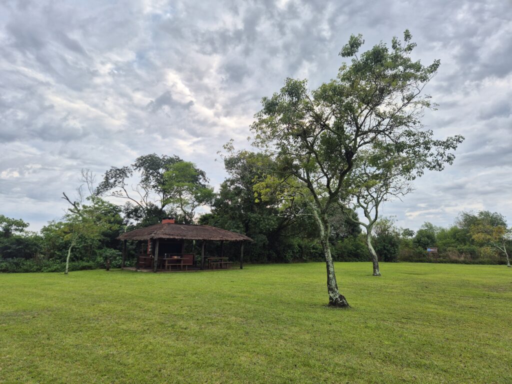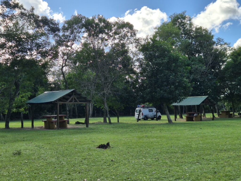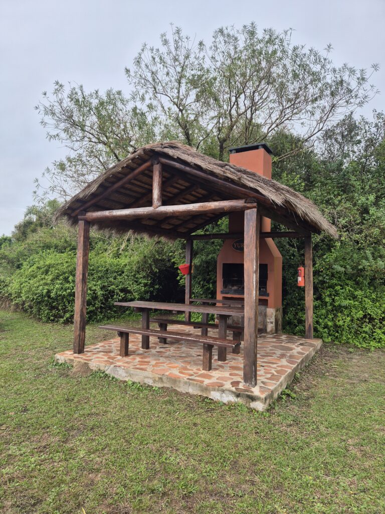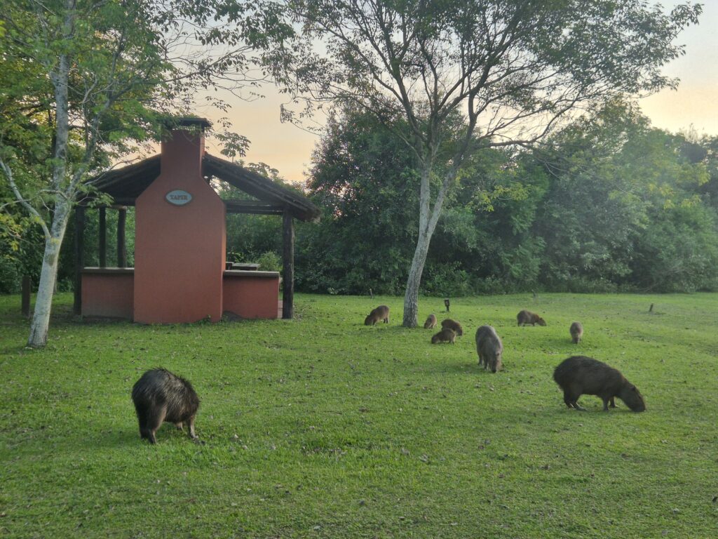 On arrive en fin de journée au campement. Les véhicules doivent rester sur le parking herbeux, en dehors du campement. Celui-ci est composé d’un bâtiment principal avec douches froides (on nous avait dit chaudes, mais nous n’avons pas eu cette chance), toilettes, prises électriques, poubelles, wifi (moyen), ainsi que de plusieurs quinchos, des abris avec table et barbecue disposés de part et d’autre d’une belle prairie. Quelques capybaras broutent autour. Un vrai paradis.