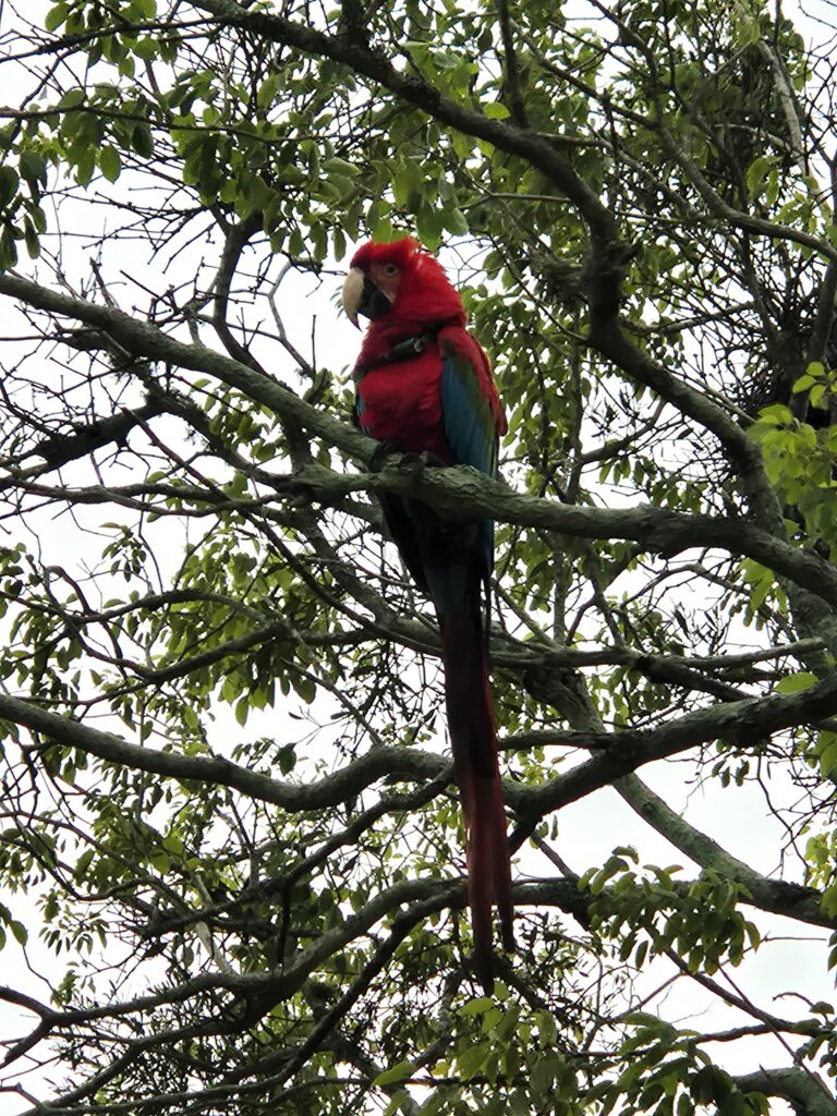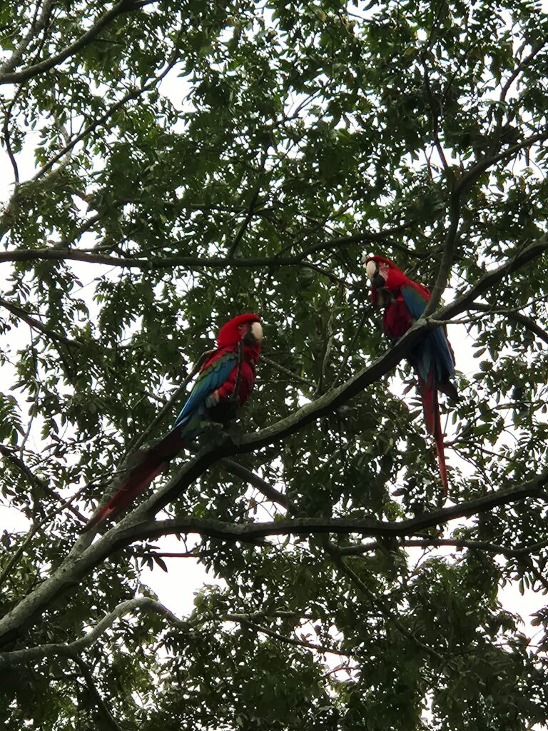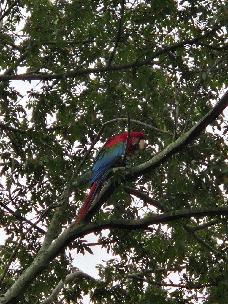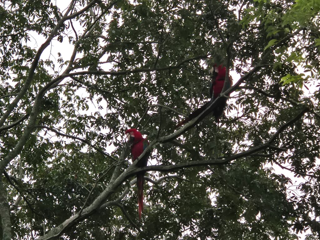 Le ranger nous avait dit que des guacamayos (aras rouges) vivaient également dans le coin, passant parfois au-dessus du campement. Ce n’est qu’au 3ème jour, lorsque Camille entend un drôle de cri, qu’elle aperçoit 3 magnifiques aras posés sur une branche à côté de l’abri ! On est comme des gamins, c’est la première fois qu’on en observe dans leur milieu naturel, et ils prennent la pose, rien que pour nous !