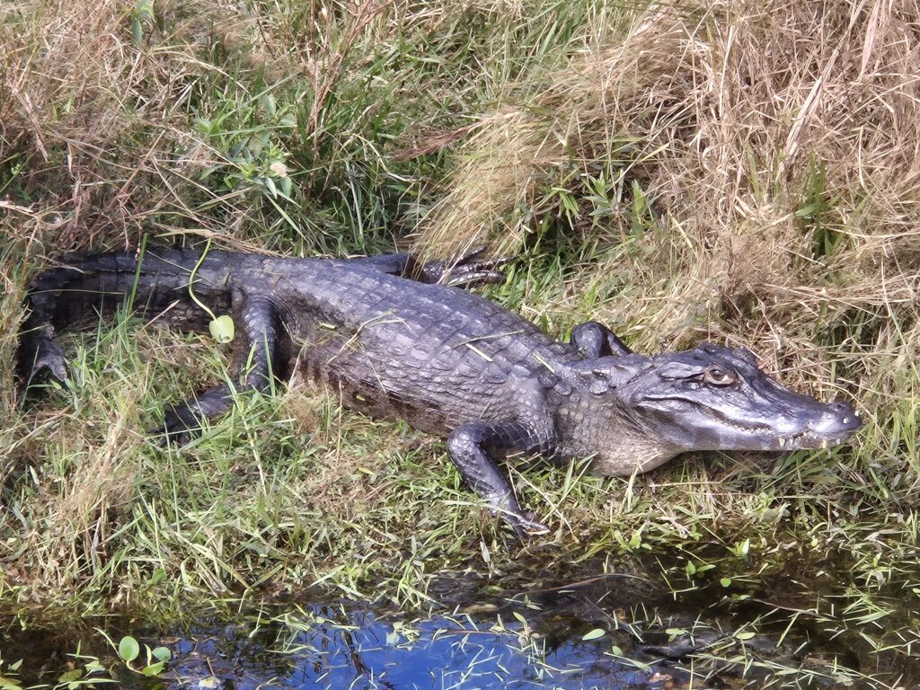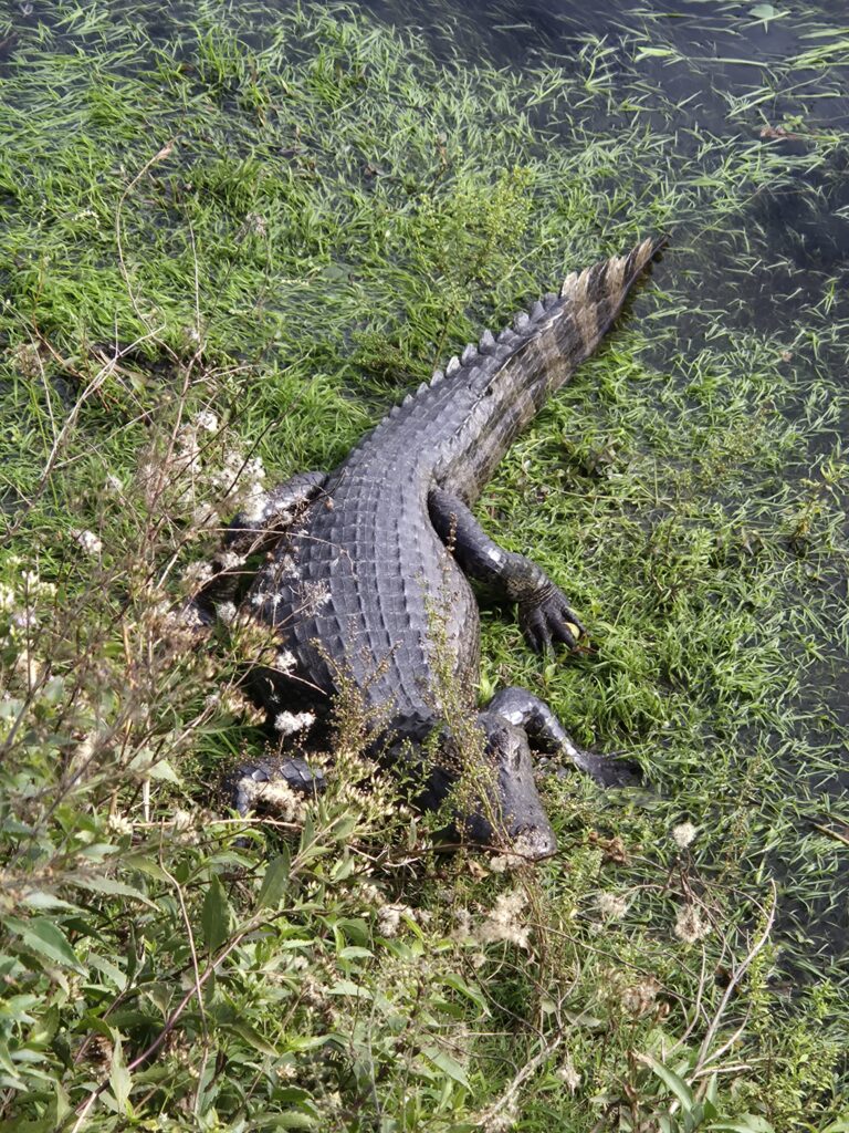 Le dernier jour, on part faire le « long » sentier du portail. On peut rejoindre le départ en voiture ou simplement marcher depuis le campement, après tout on croise une profusion de faune déjà sur la piste qui mène au sentier. Discrets jusque-là, on découvre avec joie nos premiers yacarés ! C’est l’espèce de caïman locale, ils ne sont pas très gros, maximum 2m de long, assez fins, et parfaitement inoffensifs. On croisera même un capybara tapant une sieste à côté.