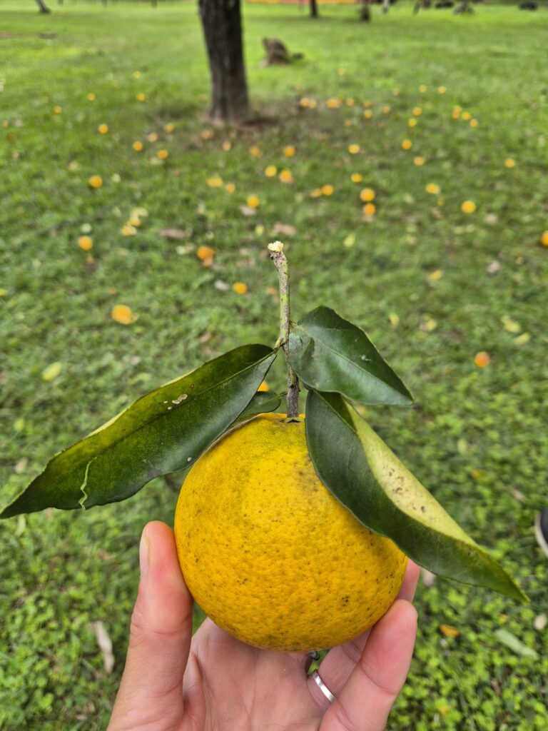Le ranger fait un tour avec nous, il nous présente quelques arbres et nous fait goûter des fruits inconnus. Il y a bon nombre d’agrumes, on s’est déjà fait avoir plusieurs fois par des oranges extrêmement acidulées. Il nous explique que ce sont en réalité des citrons pourtant très orangés et parfaitement ronds., il y a aussi des oranges amères et il nous montre le seul véritable oranger comestible ! Cette fois les oranges sont parfaites, très sucrées. On récupère un peu les vitamines perdues avec la météo des derniers jours !