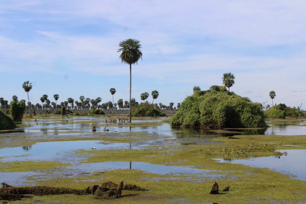 Ces hauts palmiers sont magnifiques et se reflètent dans les eaux calmes des marécages. Ils nous rappellent la partie est du Chaco au Paraguay avant de parvenir à Asunción et qui était caractérisée par le même type de biotope.