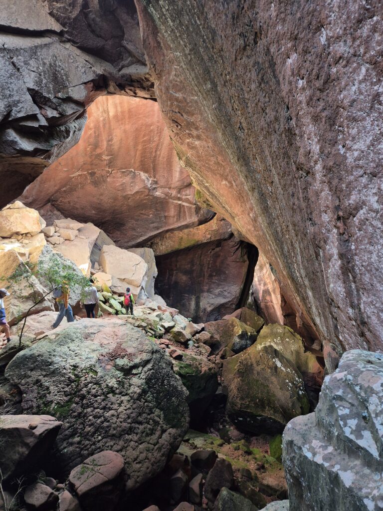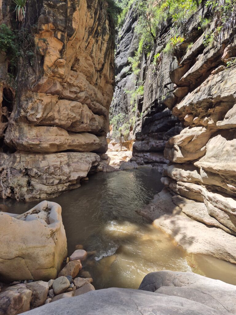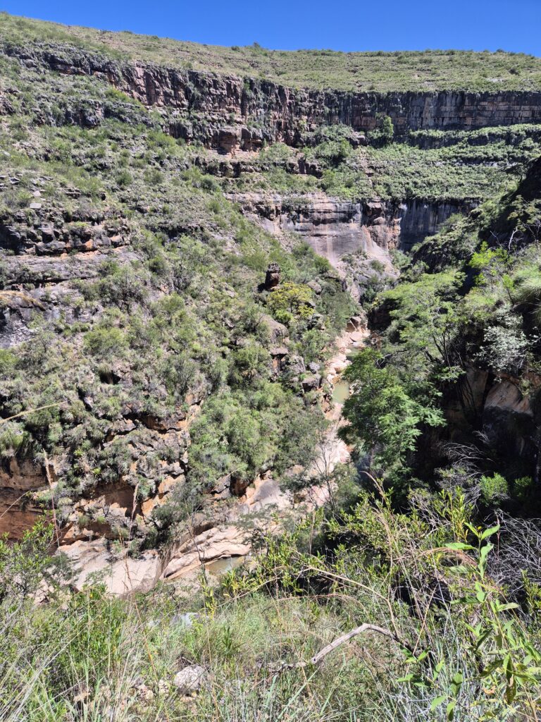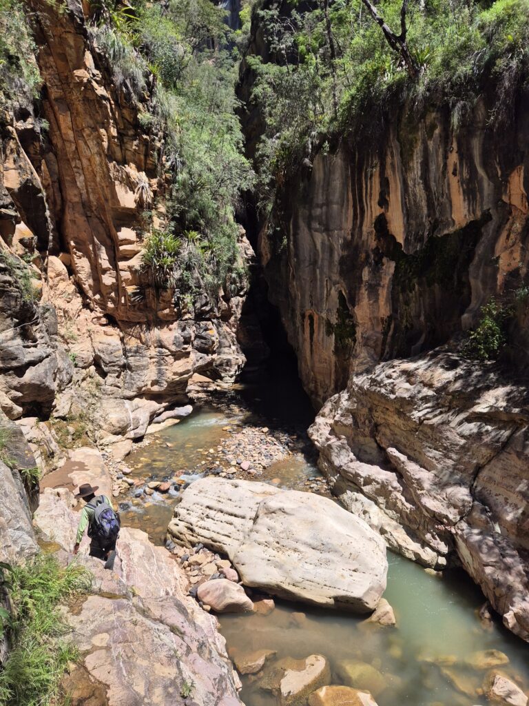 Deuxième jour, départ pour le canyon Vergel ! On retrouve nos 2 français avec qui on s’était entendu la veille, et c’est parti pour un peu de marche afin de rejoindre le canyon. On parcourt de petites prairies sèches où l’on observe de nombreuses petites fleurs en cette fin de saison des pluies. En cours de route, le guide nous montre de nombreuses empreintes de dinosaure. A vrai dire, une infime partie est réellement visible, il y en aurait plusieurs milliers ! Le parc aurait fait le choix de laisser la nature agir et de ne pas déterrer manuellement les empreintes.