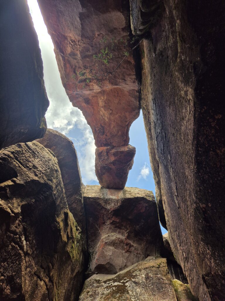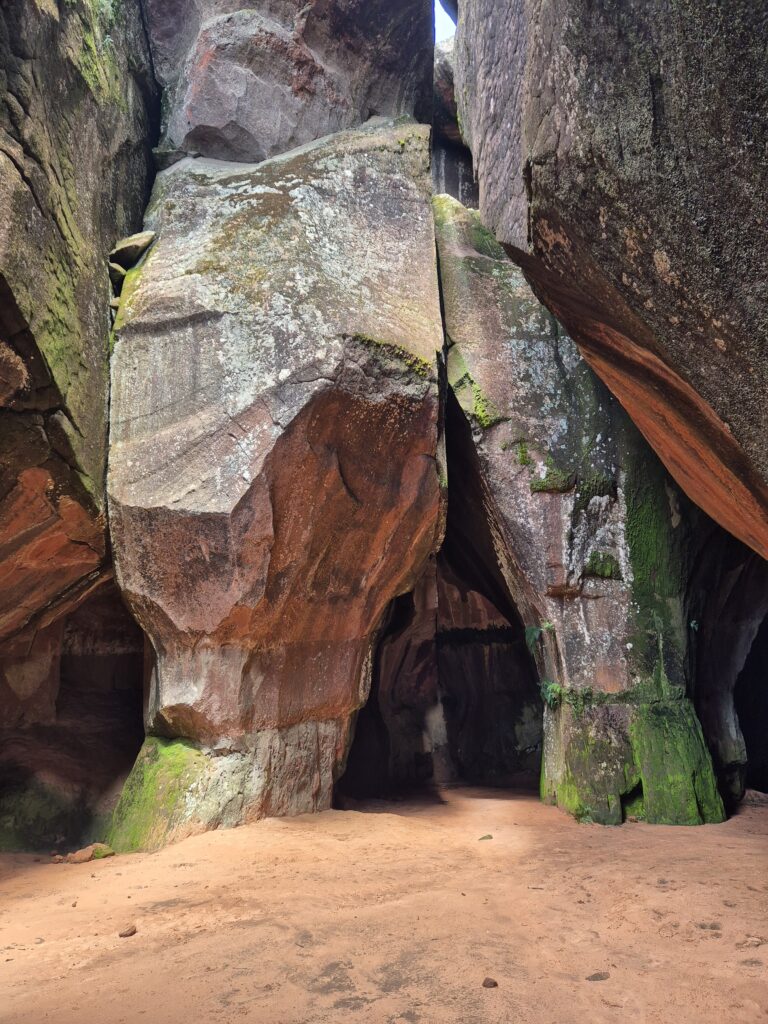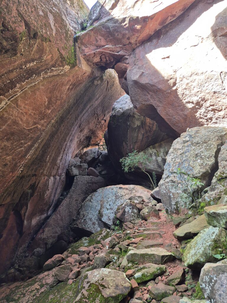 Un peu plus tard, c’est le moment classique des formes de rochers. Celui qui ressemble à un animal, celui qui s’apparente à un bateau… On descend dans un petit canyon où poussent quelques arbres et qui abrite de magnifiques cavernes où la lumière du soleil pénètre pas de fines brèches. De la mousse prend un aspect doré selon l’orientation.