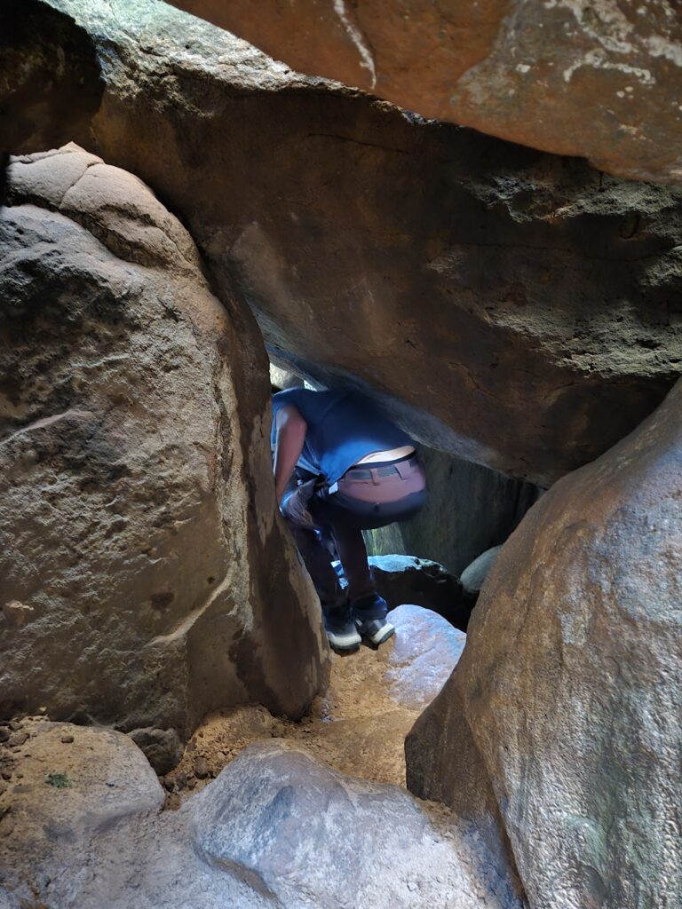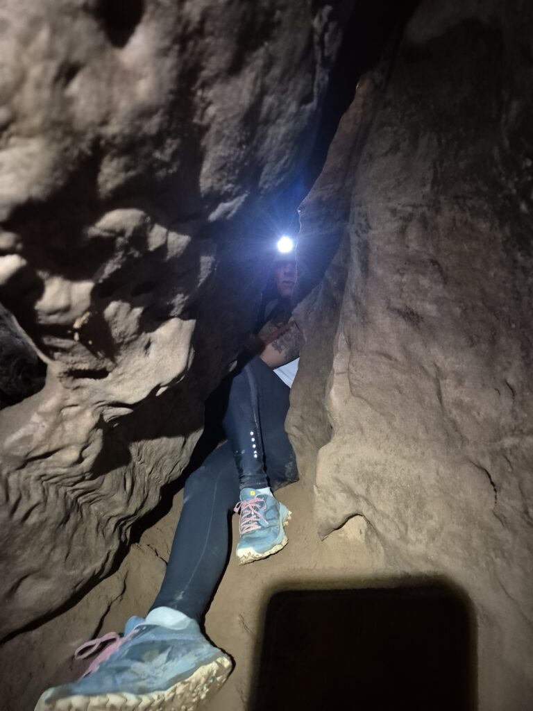Attention, claustros s’abstenir ! Les guides ne l’évoquent à aucun moment (du moins, avant qu’on y soit…) mais certains passages sont très très ténus. On est forcé à plusieurs reprises de ramper voire se contorsionner pour passer dans de fines brèches, tout ça dans une pénombre totale. Même Camille panique en croyant rester coincée à un passage particulièrement compliqué.