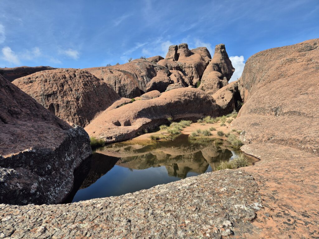 Une fois parvenu à destination, on abandonne la voiture pour une balade au milieu des formations rocheuses. Le guide nous présente d’indiscernables peintures qui auraient été réalisées par leurs ancêtres qui peuplaient la région et se réfugiaient parfois à l’abri de cette cité de pierre qui tient donc son nom tant de ses formes que de l’usage qui en fut fait par le passé.