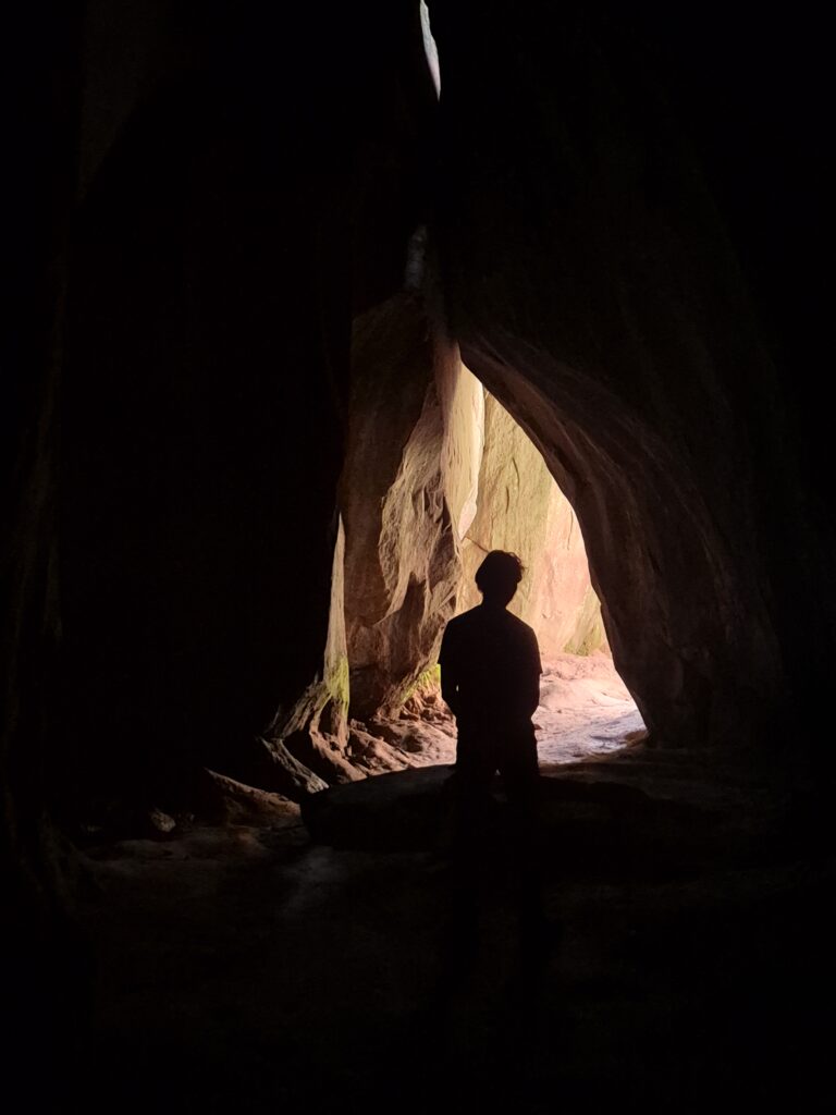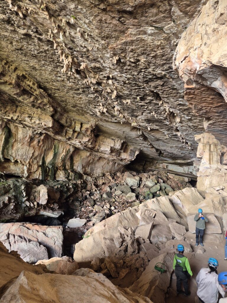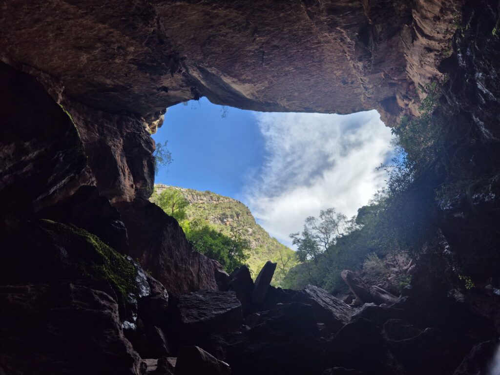 Descente à la grotte, quelques vizcachas fuient à notre approche. L’entrée est immense et on s’engouffre déjà dans les sombres profondeurs de la caverne.