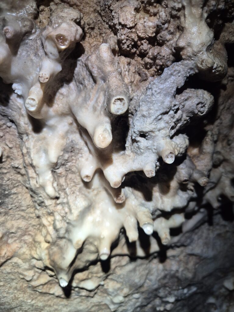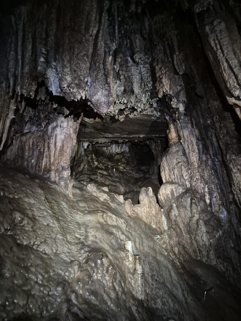 On observe de nombreuses formations rocheuses : stalactites, stalagmites et autres colonnes, mais aussi de petits bassins formés par l’eau ruisselante. A un moment le guide nous propose d’éteindre les frontales et de profiter de quelques minutes dans le noir le plus totale à entendre les simples ruissellements de l’eau.