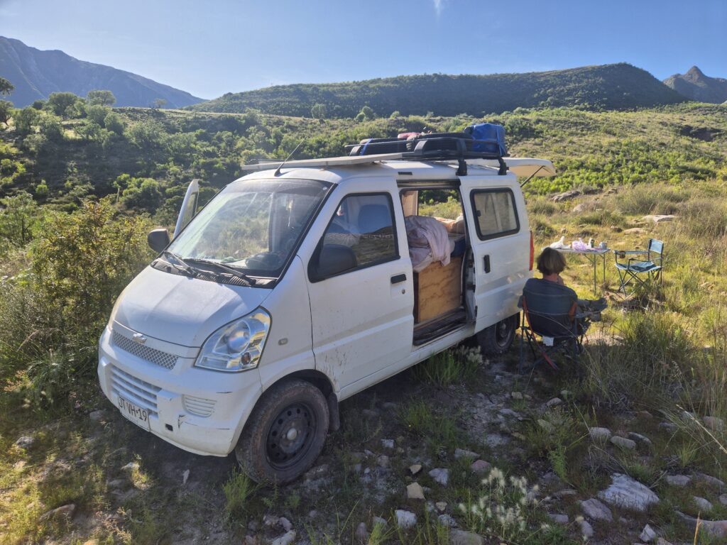 A la sortie, on croise un couple français avec qui on se donne rendez-vous le lendemain pour le canyon Vergel. Il est temps maintenant de trouver notre lieu de bivouac, on sort du village par une piste plutôt incertaine. Il fait nuit et on ne repère pas forcément de lieu propice ; on décide de faire demi-tour et voilà qu’on plante le van au milieu de la descente, le réservoir sur un rocher. On met quelques cailloux devant les roues, un petit coup d’accélérateur et hop on sort la voiture de ce mauvais pas. A priori pas de fuite, on verra bien demain matin. On se pose en bordure de chemin, ce n’est pas le terrain rêvé mais on ne dérangera personne.