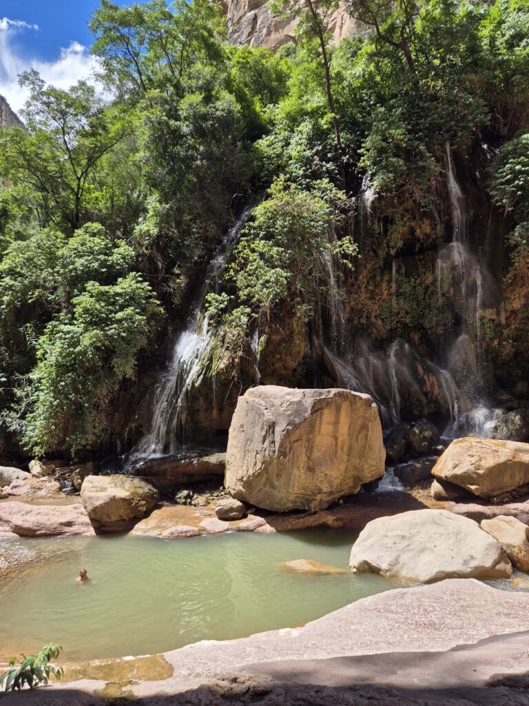 La balade dure quelques heures et on parvient en début d’après-midi à une jolie cascade … où l’on fait une pause pour se restaurer et surtout se rafraîchir ! L’eau est plutôt frisquette mais on profite avec plaisir de cette baignade.