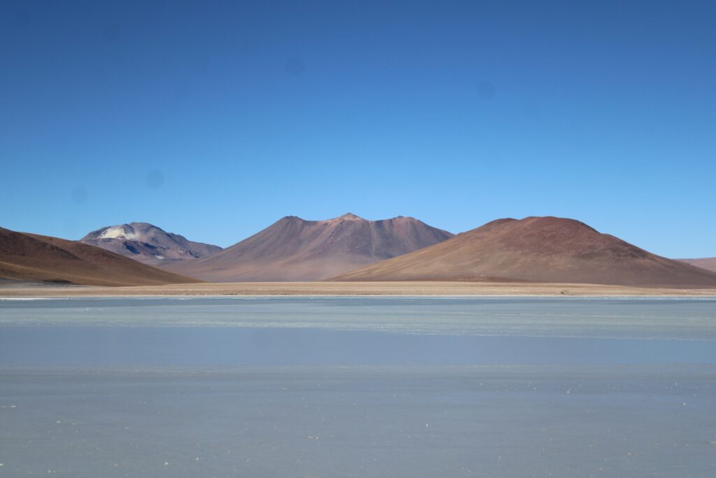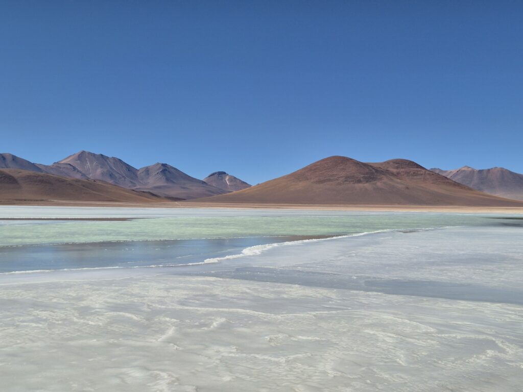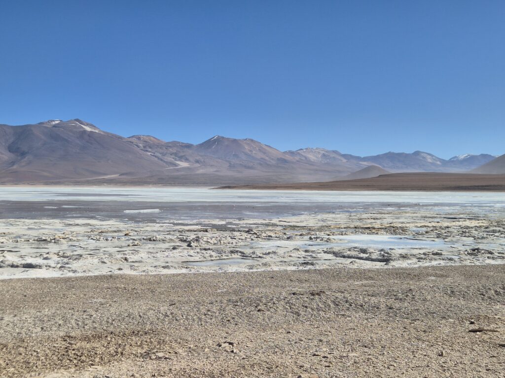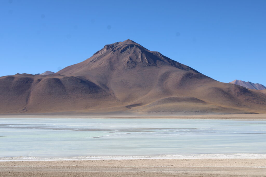 Les lagunas Verde et Blanca sont magnifiques et le Lincancabur en toile de fond complète ce formidable tableau. Les flamants roses ont presque tous foutu le camp avec l’hiver, et un manteau de glace recouvrent parfois les lagunes. La piste qui passe au sud est dans un état très correct, mais nous ne parvenons pas à rejoindre le mirador au nord de la Verde, la faute à un long gué à moitié gelé.