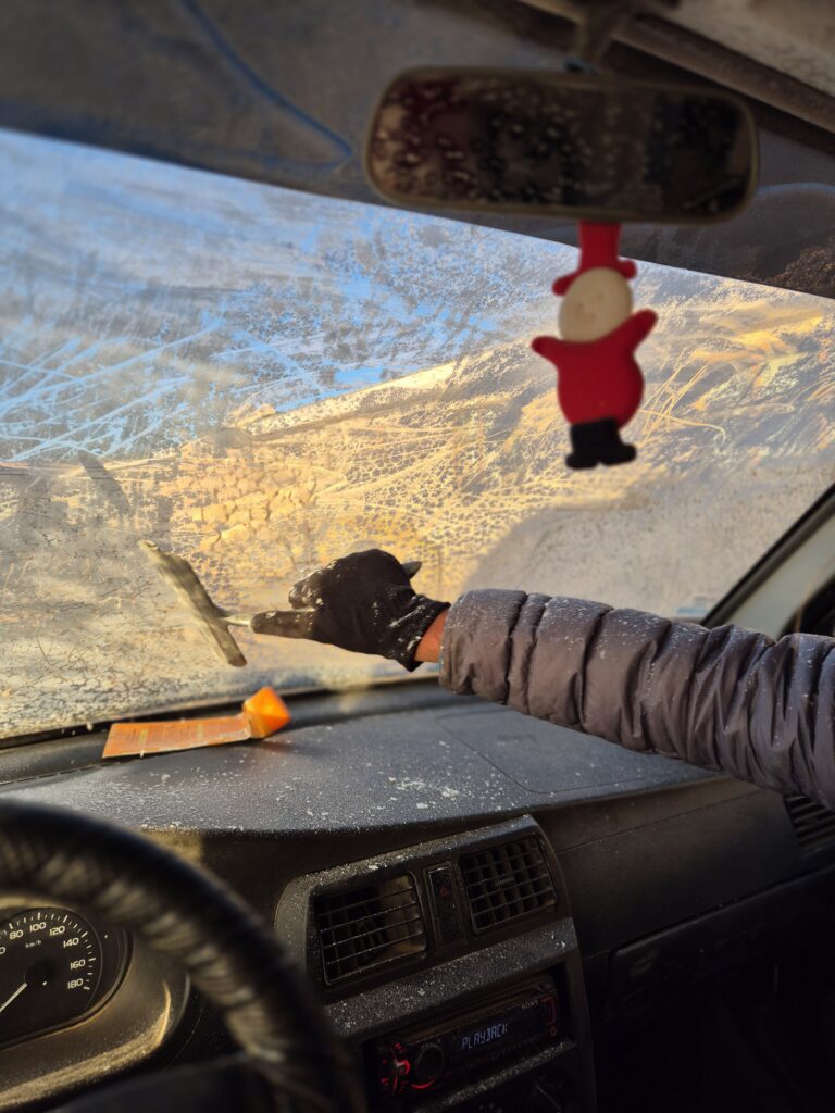Au lever du soleil, nous sommes toujours là. La nuit a été longue, glaciale, nous n’avons pas dormi. Finalement toutes nos couches ont été suffisantes pour résister au froid. Dans le lit, des monticules de neige sont présents, les draps sont mouillés, complètement gelés. Dehors une épaisse couche recouvre la route. La voiture est couverte de glace, il faut forcer pour ouvrir la portière.