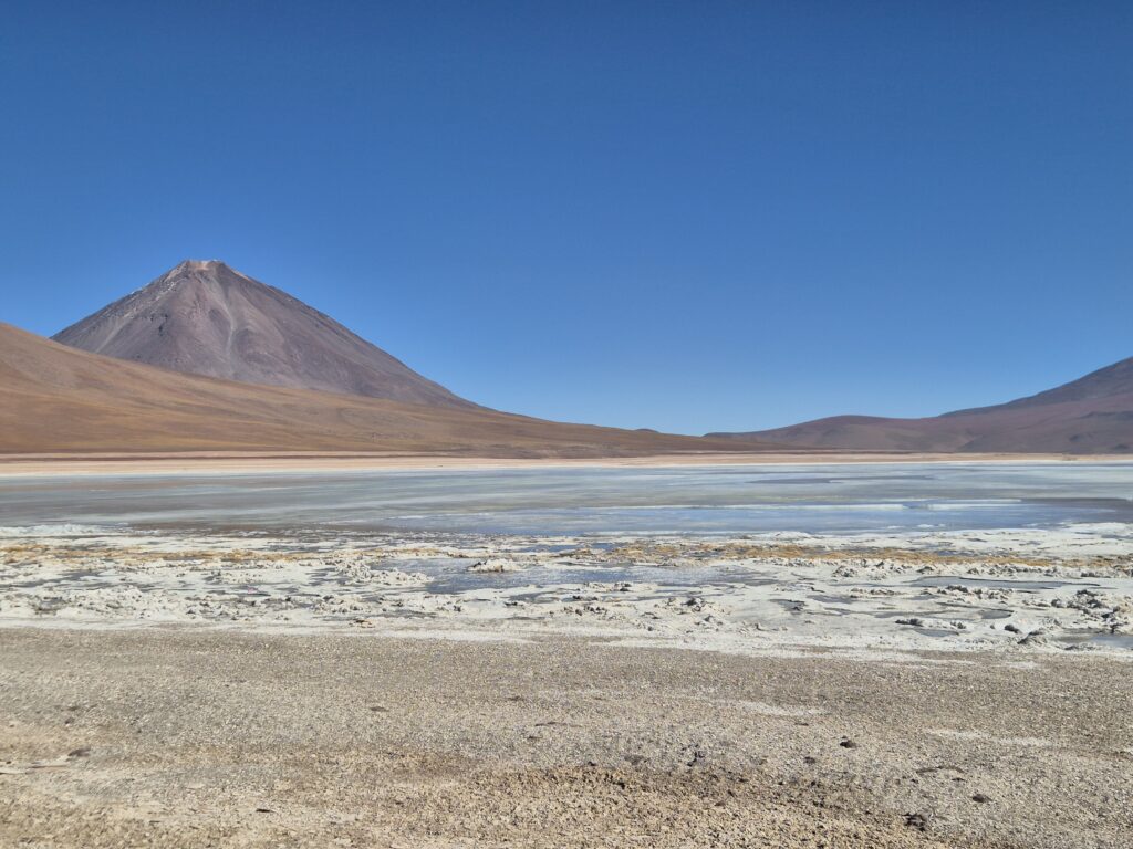 Il est encore relativement tôt, on décide de marcher entre la laguna Verde et la laguna Blanca, pour profiter des vues sur le volcan Licancabur. John a prévu de le grimper demain et souhaiterait voir si la piste qui y mène est dans un état correct. En pratique il n’est pas permis de monter au Licancabur sans guide bolivien. D’ailleurs la piste est fermée quelques kilomètres avant le départ. Dans les faits chacun fera ce qu’il veut de cette info ! Néanmoins l’ascension du Licancabur représente 1200m de dénivelé, ce n’est pas à sous-estimer à cette altitude, d’autant en arrivant de San Pedro de Atacama.