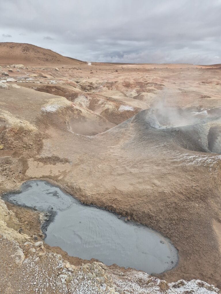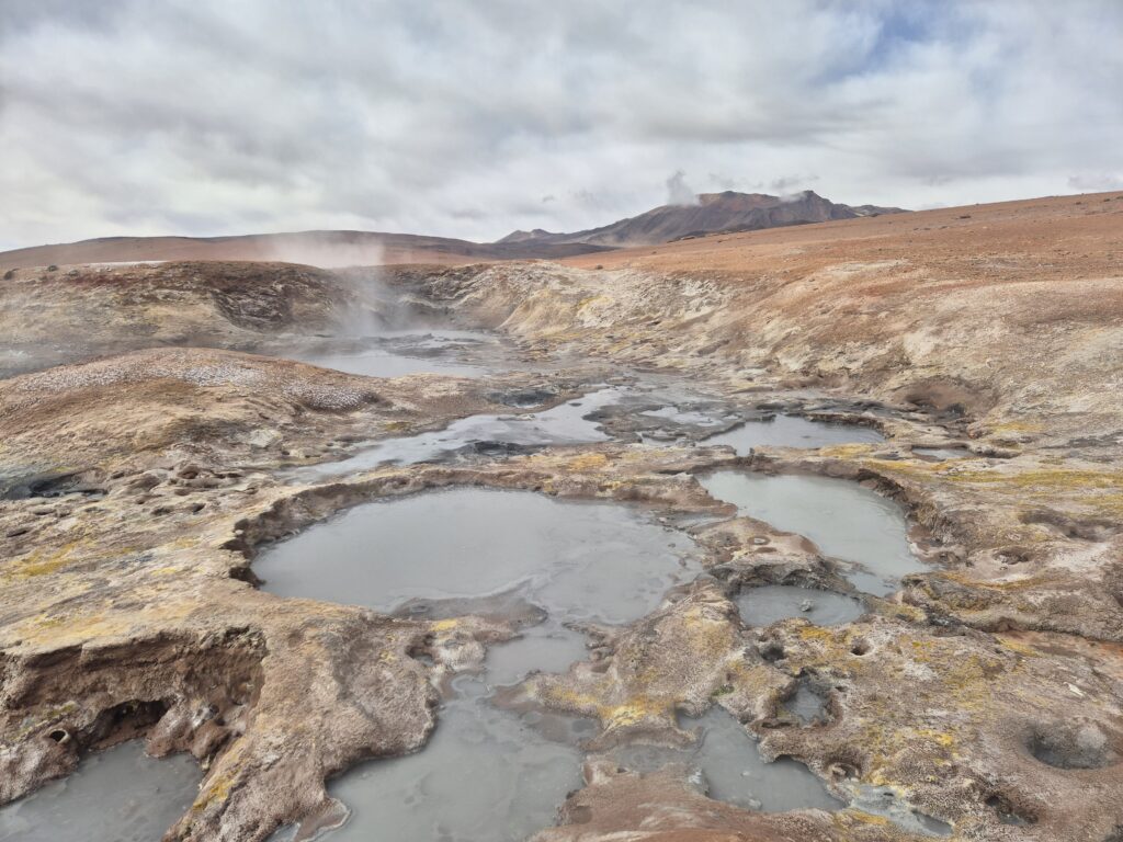 Il est temps de partir, on prend la route des geysers et on se gare le long de la piste principale. Le chemin pour les geysers est un peu plus compliqué à négocier, on ne souhaite pas s’y risquer. Camille n’a pas la force de marcher jusque là-bas, John s’y rend seul. A cette heure, il n’y a personne, c’est agréable de déambuler au bord des geysers qui pour le coup sont bien différents de ceux d’El Tatio au Chili, finalement à seulement quelques dizaines de km d’ici. Ils sont sans doute moins impressionnants mais les alentours offrent toute une panoplie de couleurs.
