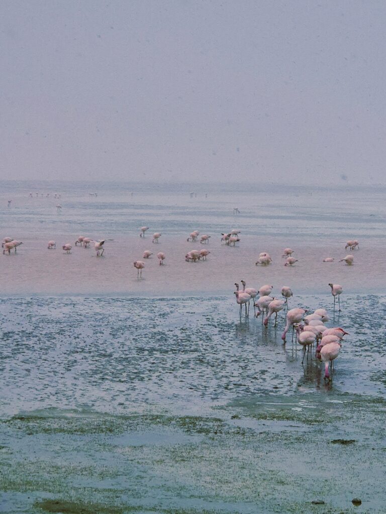 On ne distingue toujours pas la lagune malgré qu’on se rapproche, il fait sombre et la neige, toujours légère, gêne la visibilité. La majorité des chemins sur notre carte n’existent pas, on cherche sans succès le croisement pour rejoindre ensuite le chemin vers Villa Mar. On décide de poursuivre quand même jusqu’à la lagune et le mirador Los Flamengos, peut-être discernera-t-on un peu la lagune de là-bas, ce serait dommage de quitter le parc sans avoir pu profiter de ses plus beaux trésors. Évidemment, toujours personne. On marche le long de la lagune et on profite des superbes teintes rougeâtres et des milliers de flamants roses. Contrairement aux autres lagunes, ils n’ont pas encore quitté celle-ci, heureusement pour nous. Après la laguna Grande côté argentine, on désespérait de trouver une lagune encore peuplée de ses colonies de flamands.