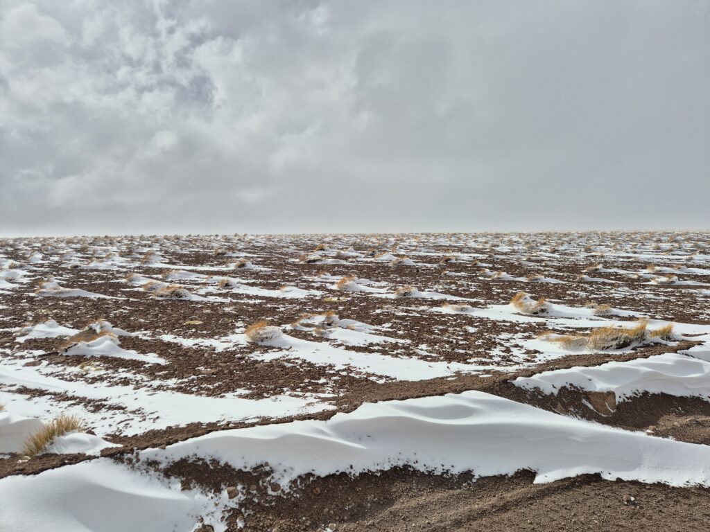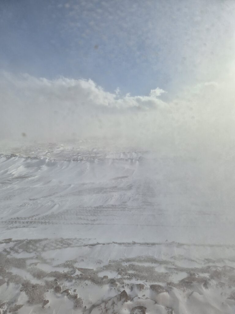 Alors que nous avons pu nous échapper et que nous approchons de la combe redoutée, le vent se lève. Le viento blanco, encore lui. Devant, le véhicule des rangers est arrêté. Nous patientons de longues minutes mais le vent redouble d’intensité. La neige pénètre à l’intérieur de l’habitacle, les vitres gèlent, la température a drastiquement chuté en quelques minutes.