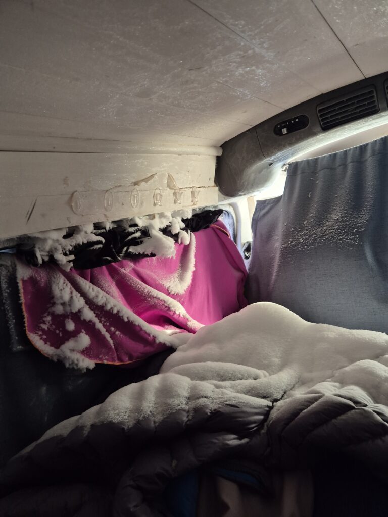 Pour la première fois depuis 4 jours, on dormira dans notre van, glacial, mais trop heureux de retrouver notre lit que l’on n’espérait plus.