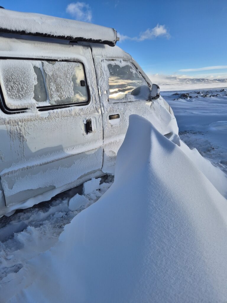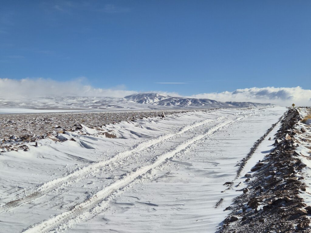 On se retourne régulièrement, au cas où un véhicule arriverait. Toujours rien, tandis que la silhouette de notre van disparaît lentement à l’horizon. Soudain on aperçoit un 4×4 qui arrive du nord, au loin. Puis un deuxième, et un troisième. Mais ils ne réapparaissent pas, on craint qu’ils n’aient pris une route secondaire. Nous les perdons de vue de longues minutes. C’est un soulagement quand nous les apercevons en bas d’une combe, bloqués par une abondante couche de neige. L’un des véhicules tente de passer mais se plante après quelques mètres. La neige est épaisse et la légère pente rend toute progression impossible.