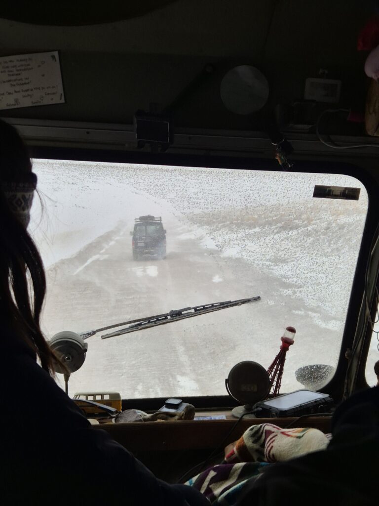 Soudain, lorsqu’on parvient au col, à près de 5000m, on glisse une première fois, une seconde puis la voiture est brusquement stoppée par une épaisse couche de neige. On essaie de reculer, de repartir, mais les roues patinent dans le vide. Nous ne voyons toujours rien autour. Le vent est puissant, des rafales à 150km/h, et glacial. Nous sommes pris au piège.