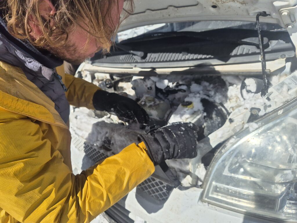 John s’affaire avec les rangers pour essayer de dégager la voiture et creuser un tremplin sur le bord de la route. A l’aide d’un bâton de rando, on essaie de briser la glace qui recouvre le moteur. A cet instant, nous n’y croyons plus vraiment. Le camion n’arrive toujours pas, et nous ne voyons pas comment on pourrait sortir la voiture de là. Camille commence à remplir des sacs d’affaires au cas où l’on devrait, une nouvelle fois, la laisser là.