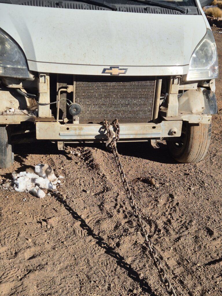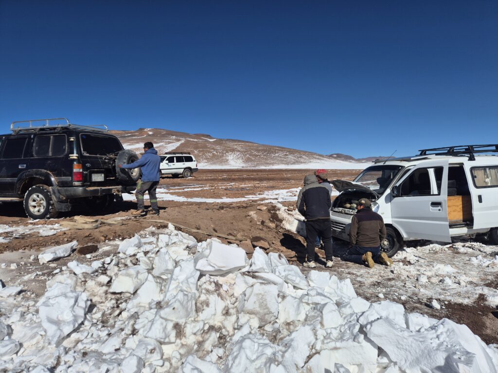 Aujourd’hui, on se lève avec un grand projet, rentrer à Uyuni. La batterie démarre, incroyable. Par contre le moteur chauffe considérablement. Le liquide de refroidissement est complètement à sec, on l’avait pourtant vérifié la veille. Nous n’en avons plus en rab, alors on remplit d’eau pour compenser, pensant à une fuite. On redémarre mais le moteur continue de chauffer. On inspecte, cherche une explication. En fait, il manque une courroie ! Nous l’avons sans doute perdue lors du sauvetage. Tout était gelé, elle a certainement rompu sur la route. On tente de fabriquer une courroie de fortune avec une sangle cousue qu’on retend plusieurs fois. Ça semble tourner… On ne perd pas de temps et on prend la direction de Villa Mar.