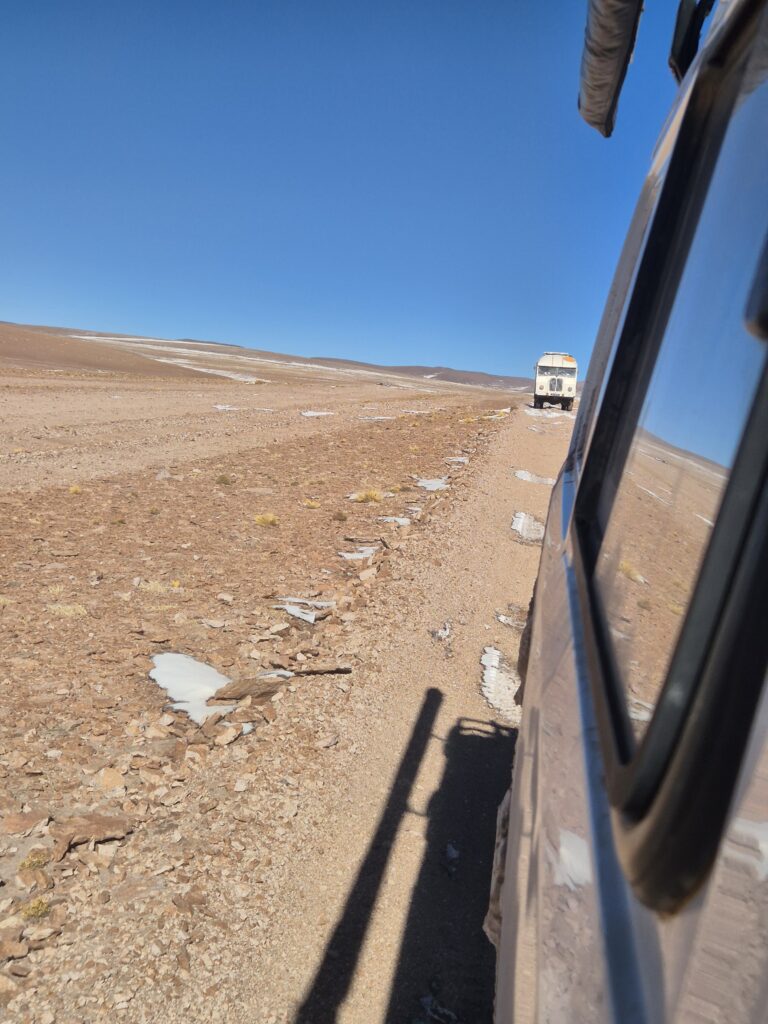 Les chauffeurs boliviens nous confient qu’ils se lèvent plusieurs fois dans la nuit pour démarrer et faire tourner le moteur une trentaine de minutes. De plus ils changent la batterie nécessairement tous les ans ! Ils ajoutent également qu’ils roulent tous à l’essence, surtout pas au diesel qui peut geler dans ces conditions. C’est amusant, il y a toujours un débat essence/diesel en haute-altitude et chacun a un avis tranché sur la question. Bref, ils nous conseillent de rejoindre Uyuni au plus vite afin de changer la batterie et peut-être l’injecteur, sans quoi cela pourrait se reproduire. Cette nuit, la température serait descendue à -20°C !