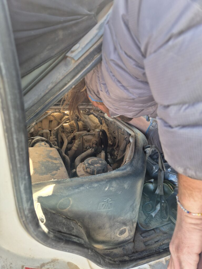Ou pas. La voiture ne démarre pas ! Depuis quelques temps, nous avons pris l’habitude, entre le froid et l’altitude, que les démarrages soient un peu compliqués et prennent quelques secondes. Mais aujourd’hui, rien ne se passe. Pire encore, l’injecteur ne produit plus de bruit après quelques essais. Peut-être que le liquide de refroidissement a gelé. Avec d’autres chauffeurs, on pousse la voiture pour la mettre le capot au soleil.