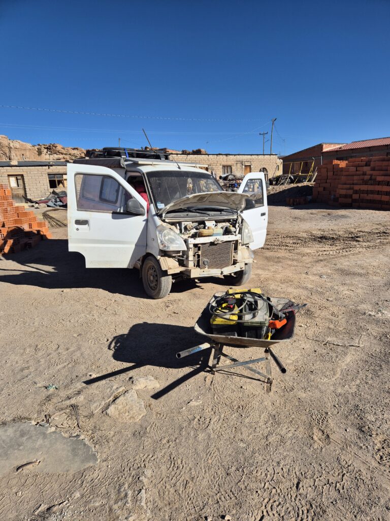 Guère d’espoir ce matin. On se motive quand même pour chercher un providentiel mécano dans le village, mais on se prépare déjà à faire l’aller-retour à Uyuni pour récupérer une courroie. On ne sait même pas où chercher, les locaux nous redirigent plusieurs fois jusqu’à ce qu’une dame appelle quelqu’un à l’intérieur d’une maison. Un petit jeunot sort, sans doute son fils. Il empile quelques outils dans sa brouette et nous suit jusqu’au véhicule.
