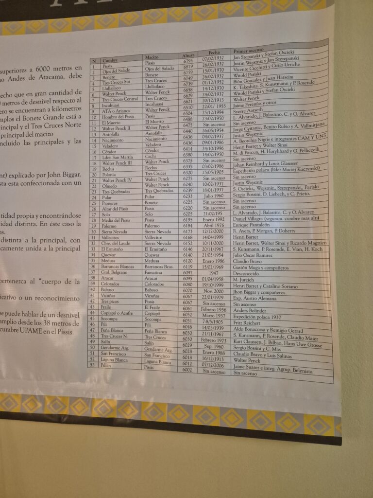 Il reste à sélectionner les sommets auxquels nous nous frotterons. Si le nevado San Francisco (6018m) fait figure d’incontournable, nous envisageons aussi une montagne intermédiaire dans les 5000m. Pour Camille, ce sera une grande première. Le volcan Tromen il y a quelques semaines constitue jusque-là le plus haut sommet qu’elle ait gravi : près de 4000m, pour 1800 de dénivelé positif. John avait déjà eu quant à lui l’opportunité de se frotter à ces géants des Andes il y a quelques années, et après avoir franchi la barre des 6300m, il rêve encore plus haut. Le mont Pissis et ses 4 sommets (6793m), l’Incahuasi (6621m) et son site Inca, ou encore le nevado Ojos del Salado (6893m), plus haut volcan du monde, les possibilités sont nombreuses. Nous jetons pourtant notre dévolu sur ce dernier.