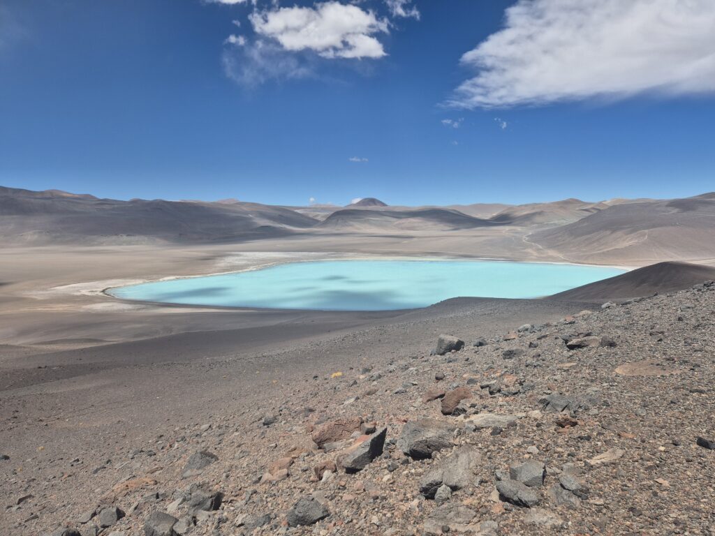On part s’aventurer dans les collines afin d’habituer le corps à produire un effort à cette altitude. Le sol est meuble, la progression délicate, mais on prend le temps d’admirer la vue ; les lagunes se colorent peu à peu avec la lumière du soleil, les teintes sont plus éclatantes en seconde partie de journée. On rentre après quelques heures mais phyisiquement on a l’impression d’être parti toute la journée…