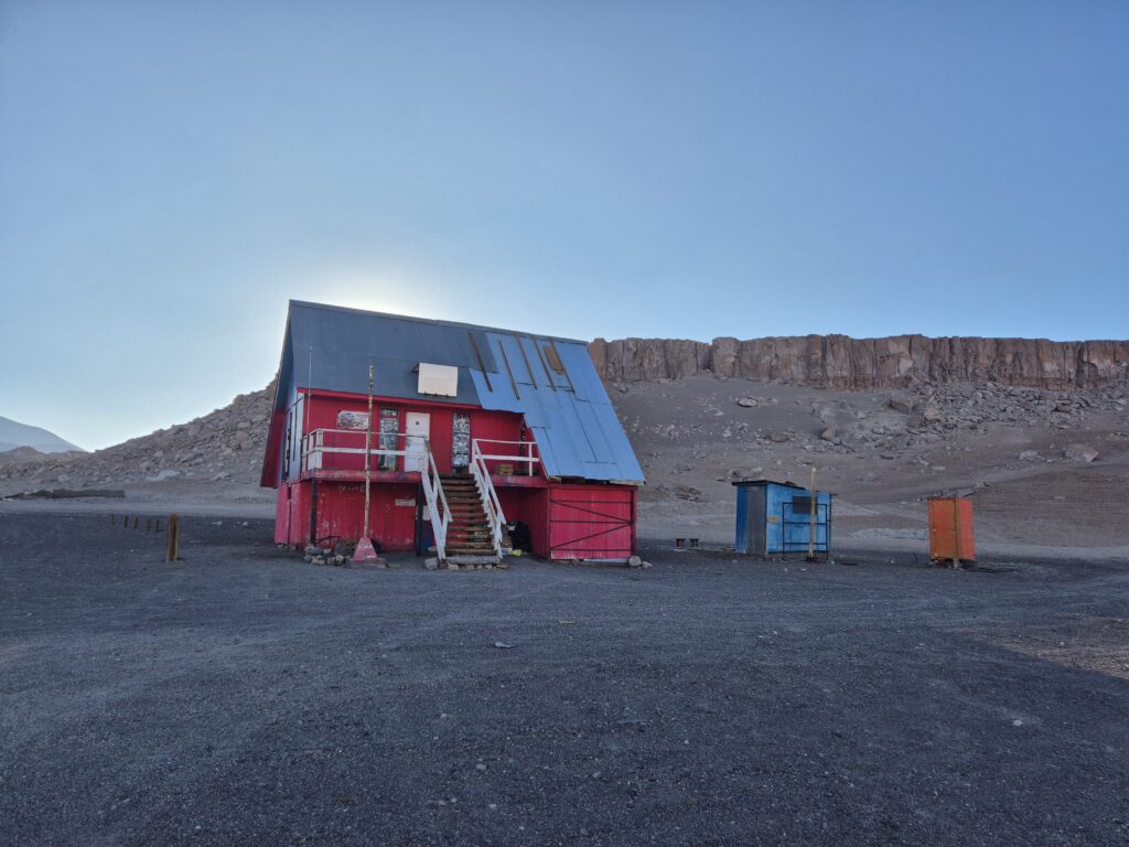 La veille, on monte au refuge en cours de journée. On y passera la nuit ; ce n’est pas l’idéal à 4700m, mais on peut prendre le petit-déjeuner à l’abri dans le refuge puis partir directement à pied au matin.