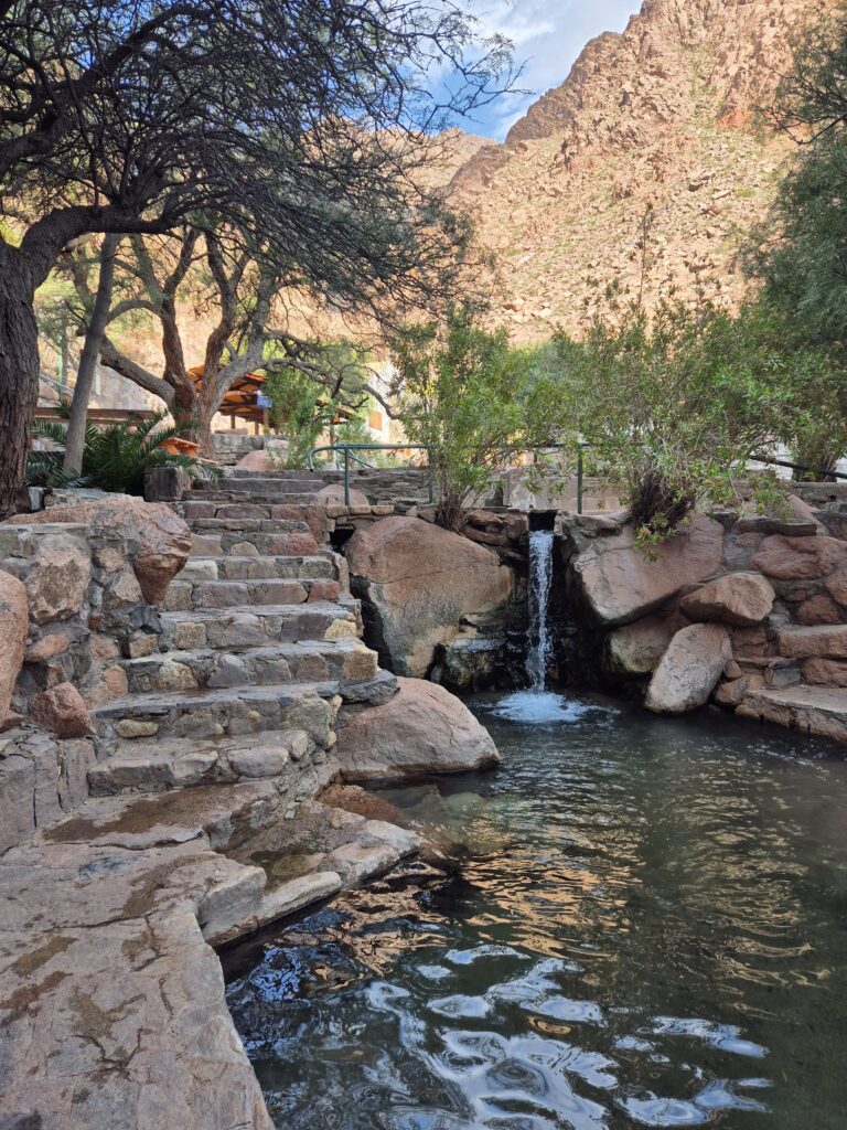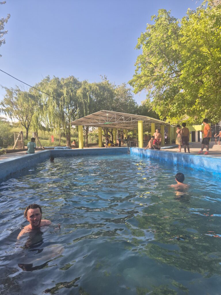 Ça y est, la récompense de tous nos efforts ! Les thermes de Fiambala sont reconnus à travers toute l’Argentine, et on comprend vite pourquoi. Ce sont sans doute les plus beaux qu’on ait vus. Ils sont donc particulièrement prisés et 3 créneaux ont été instaurés pour réguler la fréquentation : 8h-13h, 14h-19h et 20h-minuit. La réservation se fait obligatoirement à leur agence, près de la place centrale de Fiambala. Il n’est pas possible de réserver pour le lendemain (peut-être seulement pour le créneau du matin), ce qui contraint à repasser par la ville le jour-même pour s’assurer d’une place.