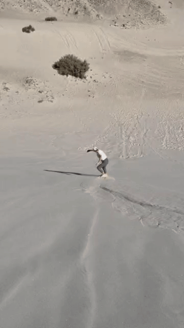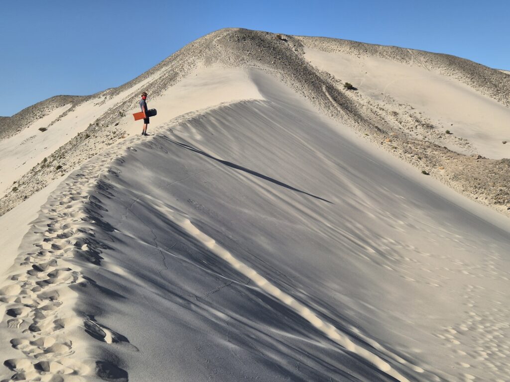 La dune est superbe, abritée entre plusieurs collines de roche. Mine de rien, remonter la trentaine de mètres dans le sable est vite éreintant. On fera peut-être 7-8 aller-retour mais les autres groupes de passage ne seront pas aussi résilients. La descente est fun, on farte les planches avec de la Wax, et on prend vite une bonne allure. C’est un peu flippant au départ et puis on prend la confiance. En chutant dans le sable, on ne risque pas grand-chose. Quoique… Un papy passe devant nous, John lui explique comment glisser. Le voilà qui prend de la vitesse, la planche se retourne et il fait des roulades sur 10 mètres. Ouf, plus de peur que de mal, on le voyait déjà en fauteuil. On aurait plutôt dû lui expliquer comment freiner avec les pieds.