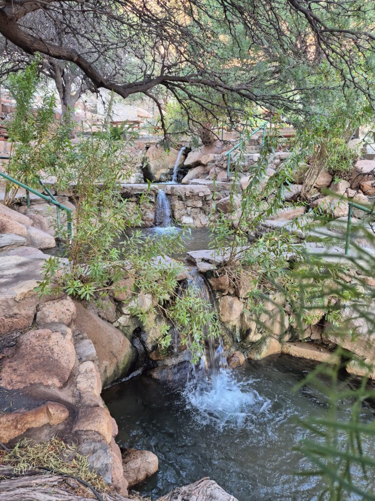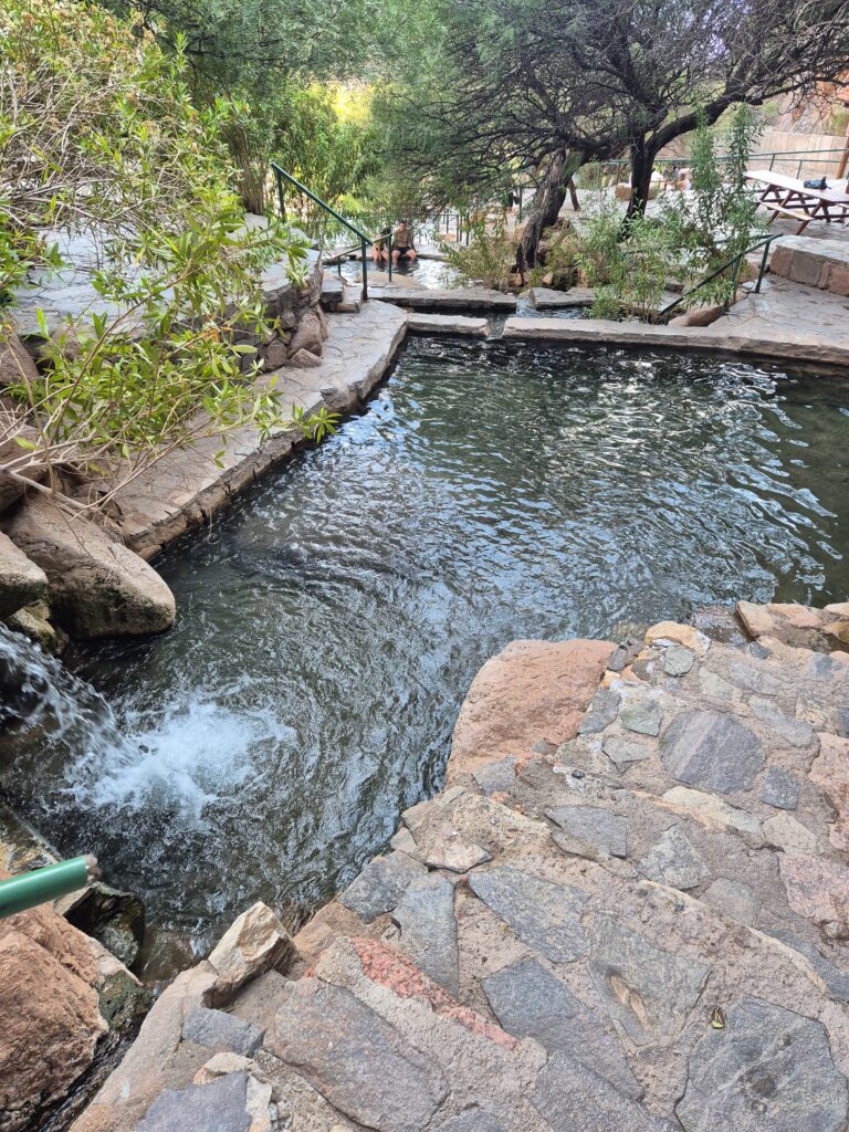 Les thermes ont été construits dans une faille au travers des montagnes. L’air y est plutôt frais, il vaut mieux se couvrir en soirée. En cours de journée on est plutôt pas mal, les piscines sont ombragées et il fait bien moins chaud que dans la vallée. Il y a également peu de monde, on se retrouve souvent seuls dans la piscine. Les gens arrivent pour la plupart en cours d’après-midi et en profitent pour pique-niquer, il y a de nombreuses tables et abris disponibles.