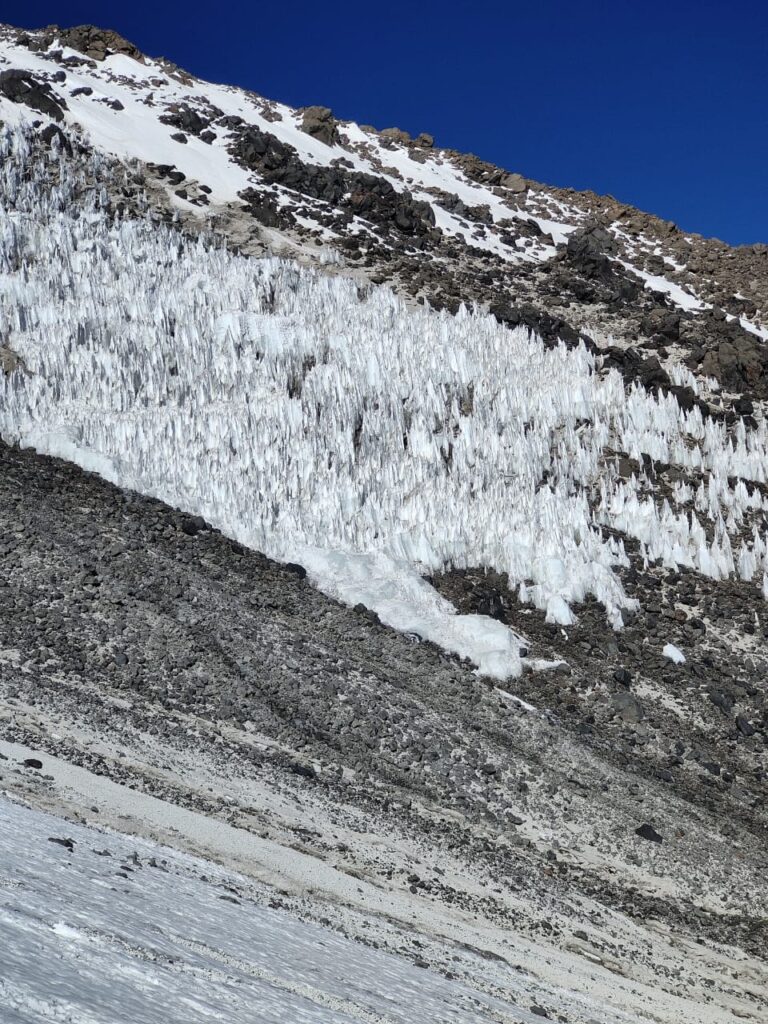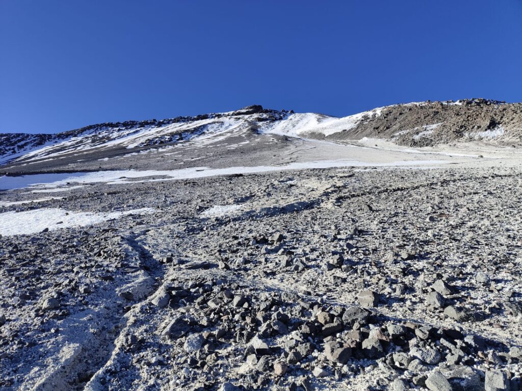 Pour nous, réveil nocturne à 5h ! On veut partir tôt, le temps se gâte souvent dans l’après-midi et on estime l’ascension à au moins 7h A/R. Petit-déjeuner « au chaud » dans le refuge et départ à la frontale à 6h. On discerne à peine le chemin dans la pénombre de la nuit. L’air est glacial, on attend avec impatience les premiers rayons de soleil qui ne nous parviendront que 2 heures plus tard. Les extrémités se refroidissent en premier : mains, pieds. Pas grand-chose à faire si ce n’est rester en perpétuel mouvement et attendre désespérément les lueurs du jour.