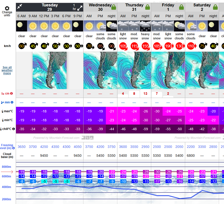L’été est la saison idéale pour considérer une ascension. Paradoxalement, c’est également une période marquée par de fortes pluies qui peuvent noyer les routes dans les vallées inférieures. Il faut également se méfier des orages fréquents de fin de journée et des vents puissants qui peuvent entraîner le phénomène de viento blanco, lorsque les rafales soulèvent la fine couche de neige au sol et rendent la visibilité quasiment nulle. Nous avons utilisé principalement Windguru et surtout Moutain Forecast pour les prévisions météorologiques. Ce n’est jamais une science exacte, qui plus est dans ces contrées hostiles et à cette altitude, mais ce sont des sources assez fiables en Amérique du Sud. Le second site donne les prévisions pour les sommets à plusieurs altitudes ainsi que le wind chill (température ressentie) et le freezing level.