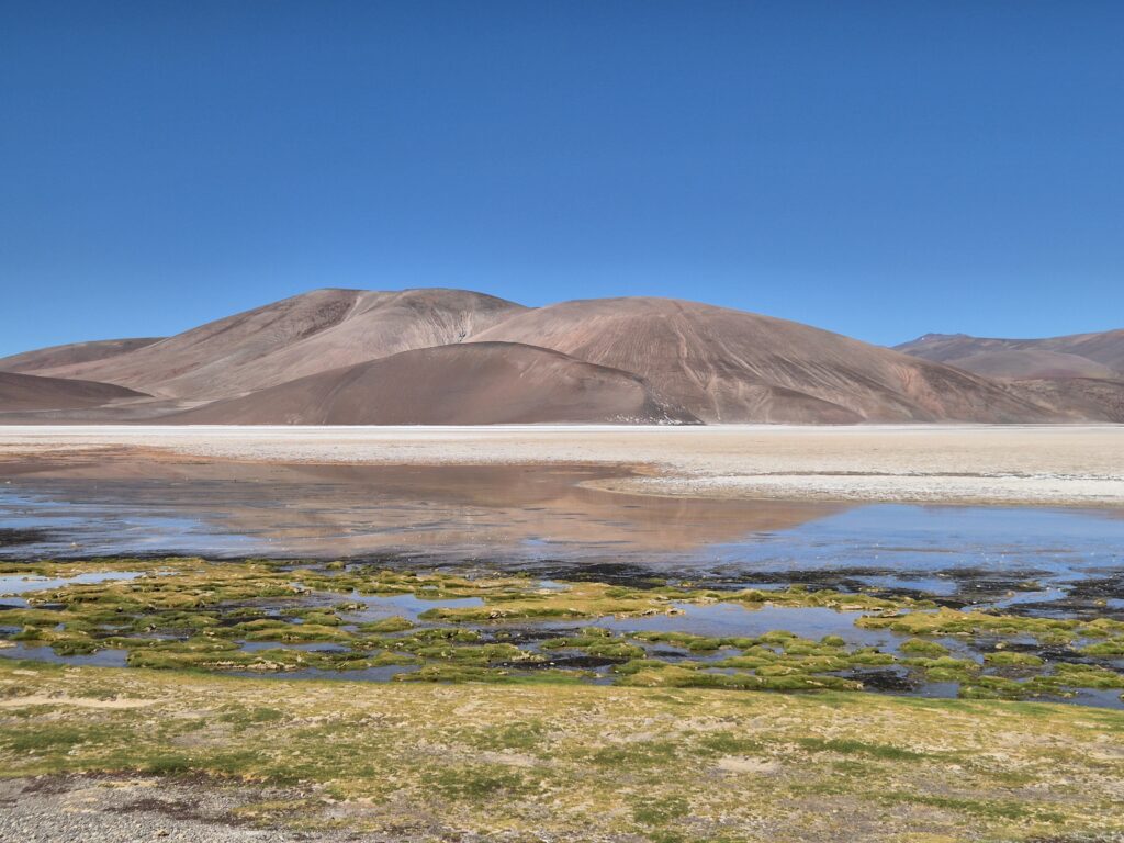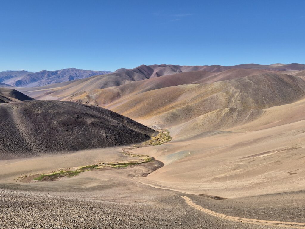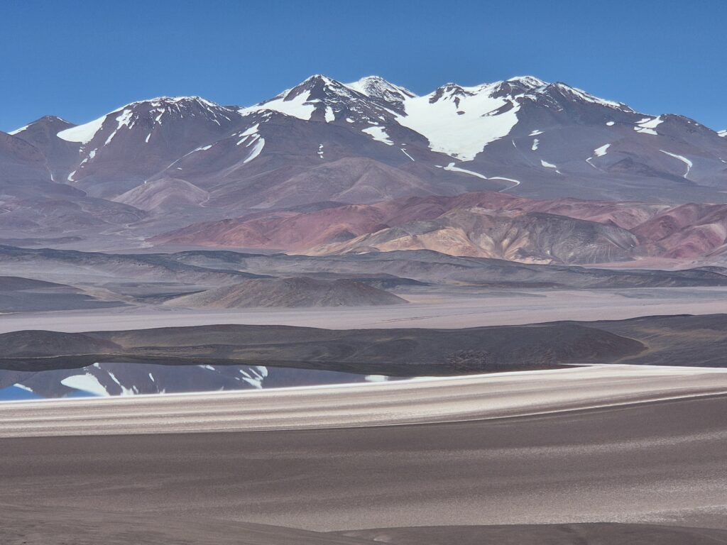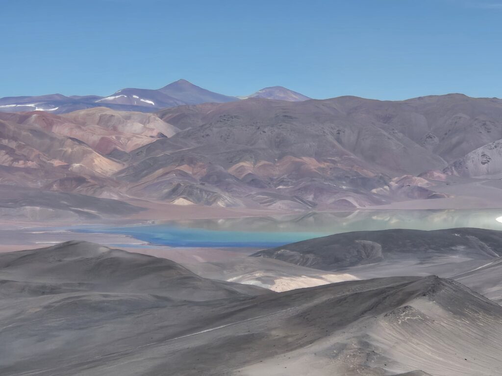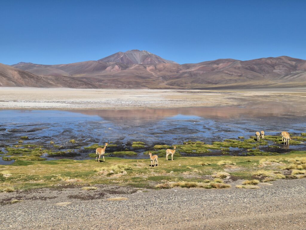 La route monte progressivement, redescend, remonte… On croise de nombreuses vigognes, quelques guanacos qui se font plus rares à cette altitude. On passe un premier col à 4500, superbe, puis un refuge semblable à ceux de la route (Starlink en moins) avant de redescendre vers la laguna de Los Aparejos. Pourvue d’une fine couche d’eau, elle s’apparente plus à un grand salar, où viennent s’abreuver les troupeaux de vigognes. On commence à croiser quelques tours de Fiambala ; plusieurs clients (et enfants) supportent mal la montée brutale en altitude et ont recours à des bouteilles d’oxygène.