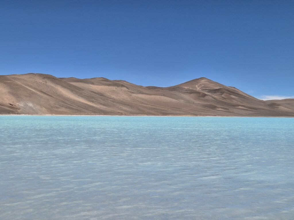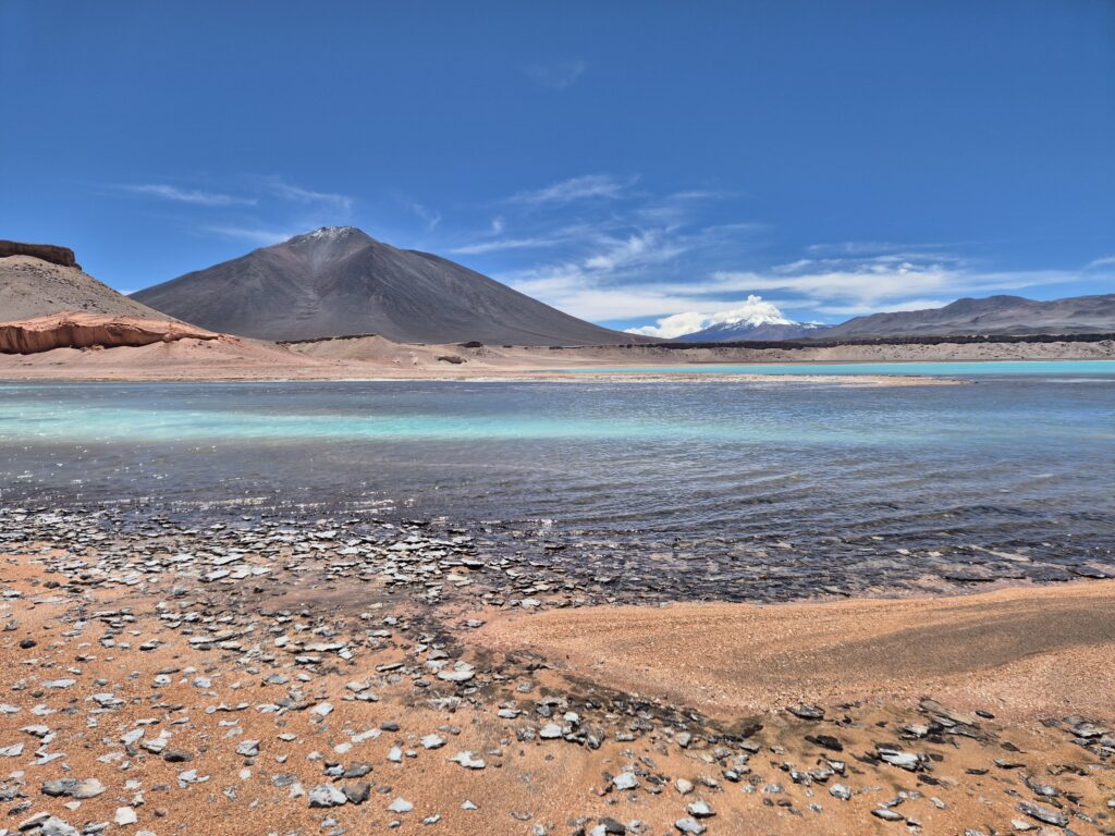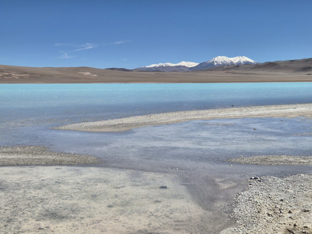 On poursuit jusqu’à un nouveau col à 4700m, on croise un second refuge, cette fois un simple container vaguement aménagé mais tout de même isolé. Il y a même une armoire à pharmacie, faut-il encore voir de quand datent les médicaments à disposition. On redescend à la laguna Azul à 4450m et on quitte la belle piste minière pour un chemin bien moins entretenu mais qui reste correct. La lagune est magnifique et s’étend sur 16 hectares. Encore une fois la blancheur du sel cristallisé et la faible profondeur offrent un contraste resplendissant avec la lumière du soleil et des tons turquoise à nulle autre pareil.