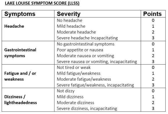 Un test d’autoévaluation a été mis au point à l’époque, le score de Lake Louise, qui permet d’estimer le degré de sévérité. Cela donne un aperçu des symptômes possibles et de leur gravité. S’ils ne doivent pas être pris à la légère, des vomissements par exemple ne doivent pas non plus être considérés comme un signe fatal. On considère qu’à partir d’un score de 6, il vaut mieux redescendre un peu en altitude.