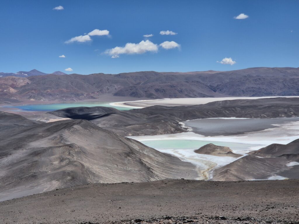 Dernière grimpette pour atteindre le Balcon de Pissis, perché à 4550m d’altitude. Balcon car il offre un panorama exceptionnel sur plusieurs lagunes aux couleurs diverses, notamment les lagunas Negra et Verde. Quant à Pissis, il s’agit de l’immense montagne en arrière-plan, surmontée de nombreux sommets (dont 4 quasiment à la même altitude – 6795m), la 3ème plus haute d’Amérique du Sud, et longtemps considérée comme plus élevée que les Ojos del Salado (bien qu’ils la dépassent d’une centaine de mètres), d’ailleurs le musée de Fiambala qui les classe par taille décroissante présente encore le mont Pissis en n°1. Son immense glacier criblé de crevasses a emporté bien des alpinistes par le passé…