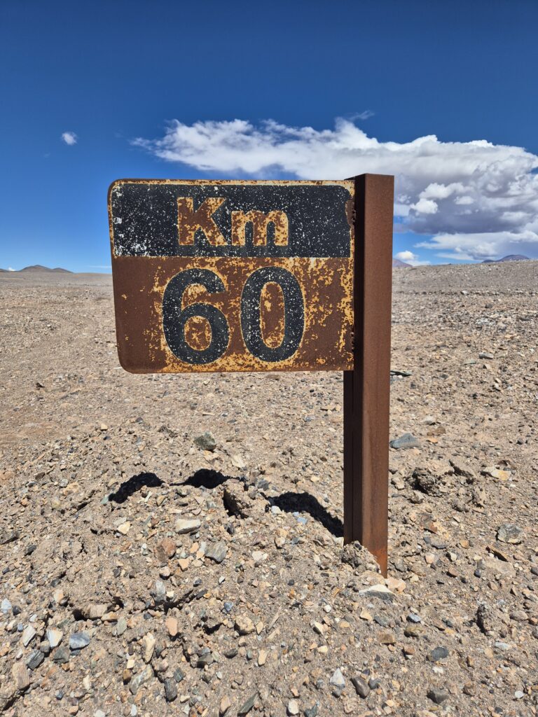 Il n’y a aucune station-service entre Fiambala et Copiapio, soit sur plus de 470km. Si on compte le détour par le Balcon de Pissis (100km), il faut donc compter sur une autonomie d’au moins 600km entre les 2 villes ! Qui plus est, comme on entre au Chili, il faut redescendre à la douane chilienne (située à plus de 100km de la frontière !) puis remonter enfin à la laguna Verde.