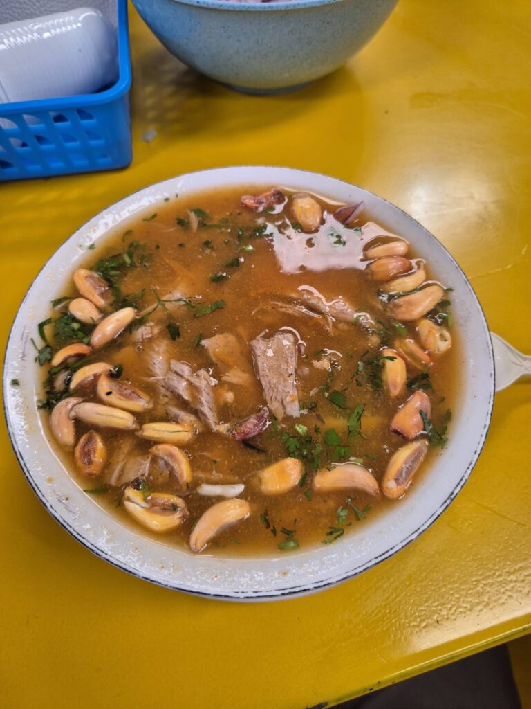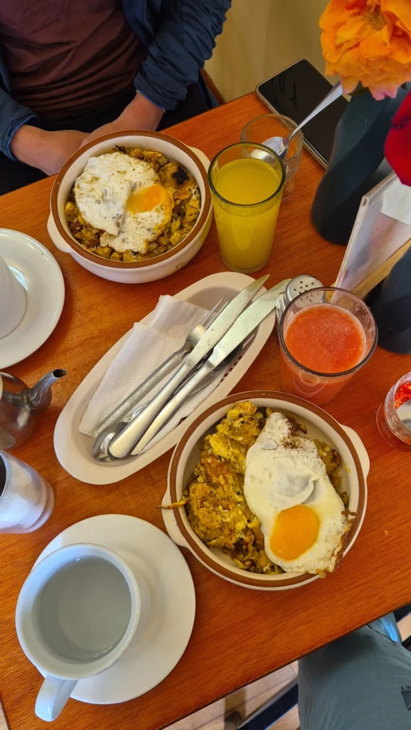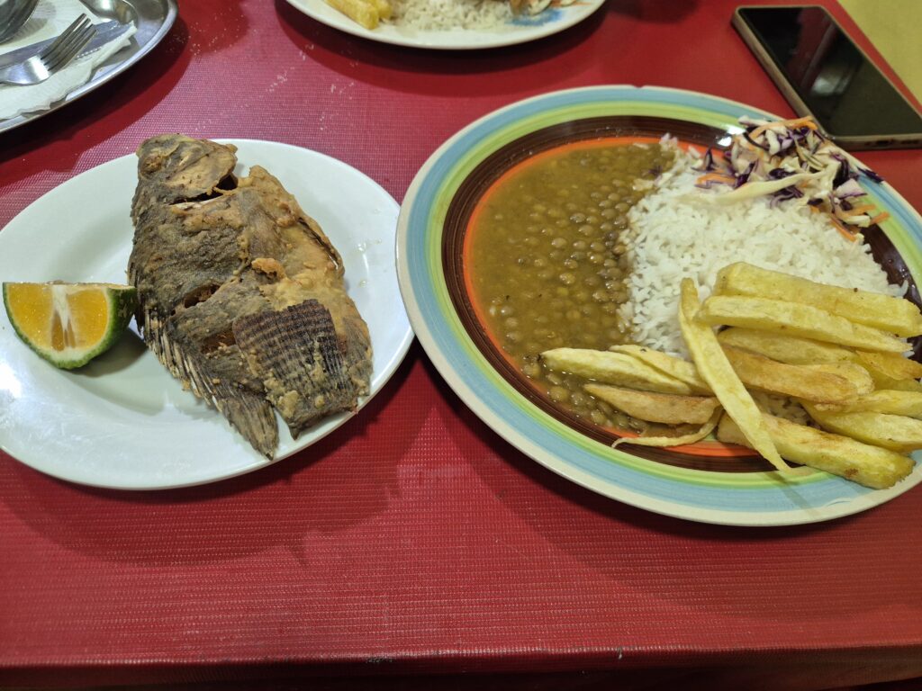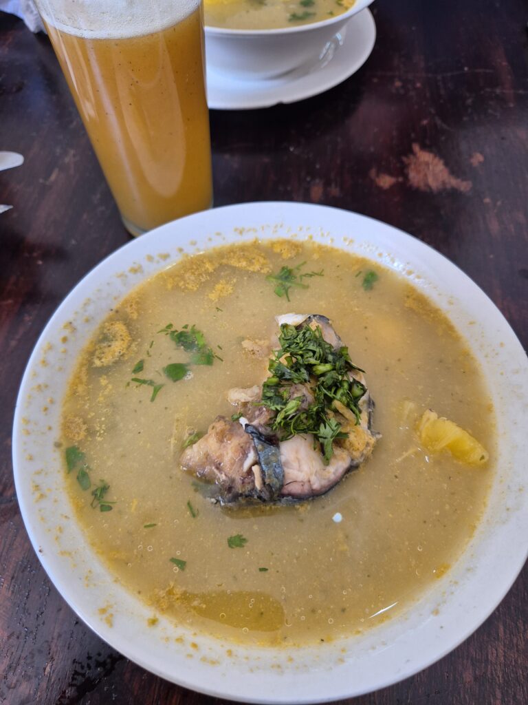 Comme pour les autres pays andins, l'almuerzo est composé d'une soupe, d'un seco (plat avec 1/4 de protéine, 1/4 de crudités et 1/2 de riz blanc sans aucun assaisonnement) et généralement un bon jus de fruits. Si les soupes sont toujours bonnes et variées, attention aux caldos (bouillons) parfois à base de pattes/crâne/abats ! C'est la manière la plus économique et complète de manger à midi (autour de 3$ en moyenne). Le soir on parlera de merienda mais ce n'est pas aussi répandu.