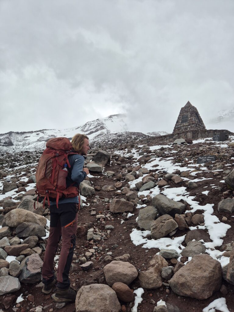 On passe un monument d’hommage à Simon Bolivar où sont disposées de nombreuses stèles d’andinistes décédés sur les dangereuses pentes du volcan. Certaines sont assez récentes, on se souvient notamment d’une terrible avalanche en 2021 qui avait emporté plusieurs guides et leurs clients.