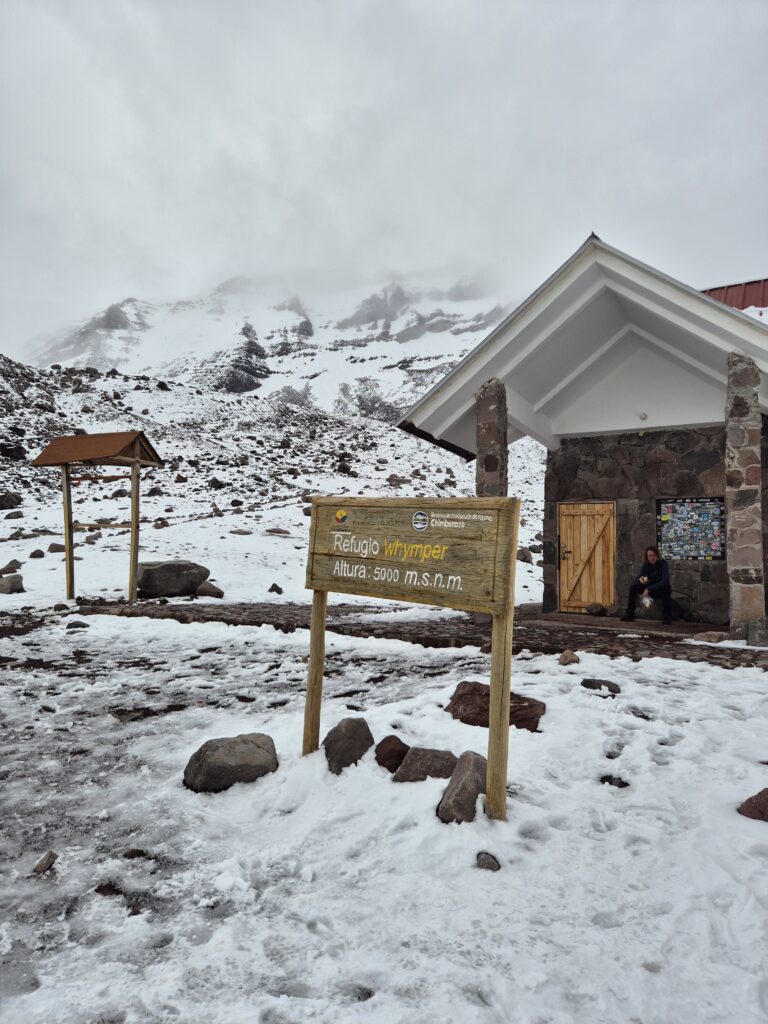 Alors qu’on monte au refuge, le Chimborazo se découvre soudainement et on profite de superbes vues sur ce colosse de glace. C’est d’ailleurs la dernière vue dont nous profiterons pour le reste de la journée…