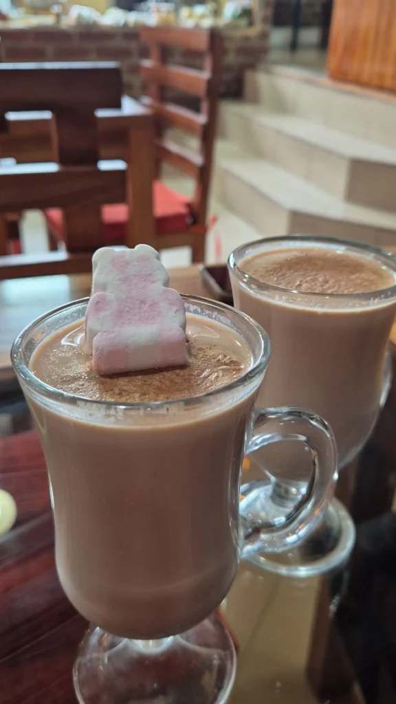 On s’offrira aussi un bon chocolat chaud au-dessus de la chocolaterie, histoire de se réchauffer un peu, on se croirait en plein hiver ici.