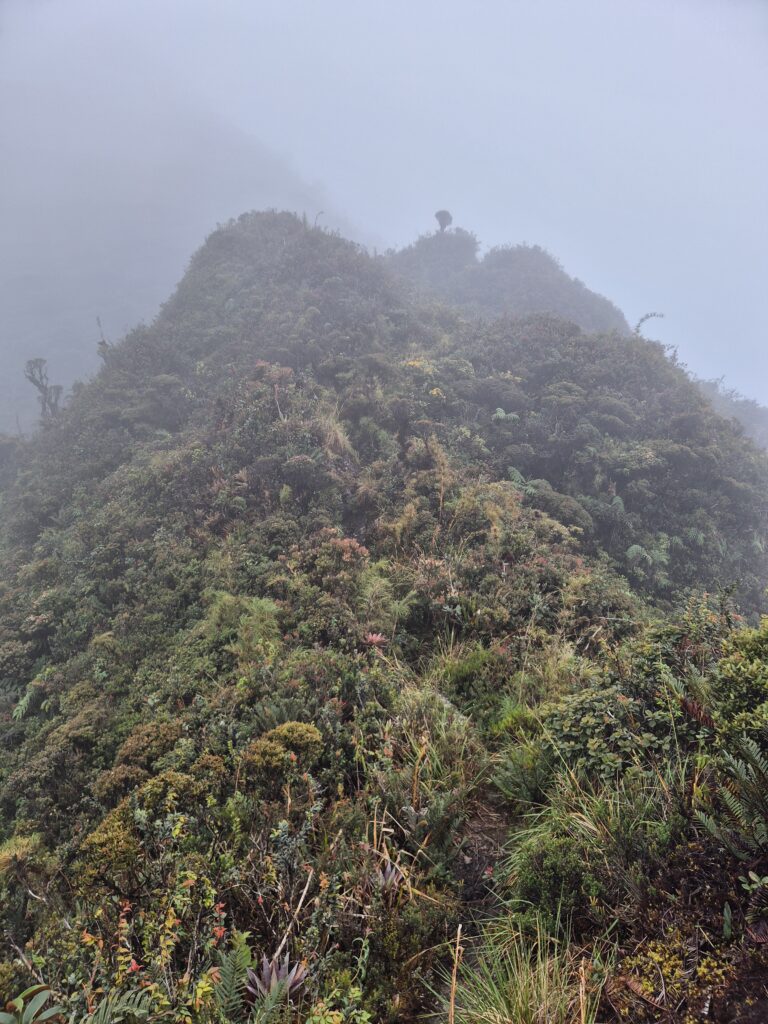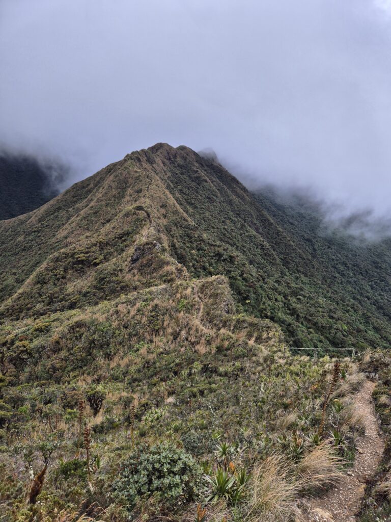 A partir de là, on attaque la longue crête souvent noyée dans la brume. C’est pentu, glissant, avec parfois des cordes fixes pour progresser, mais les vues (quand le temps les permet) sont splendides.