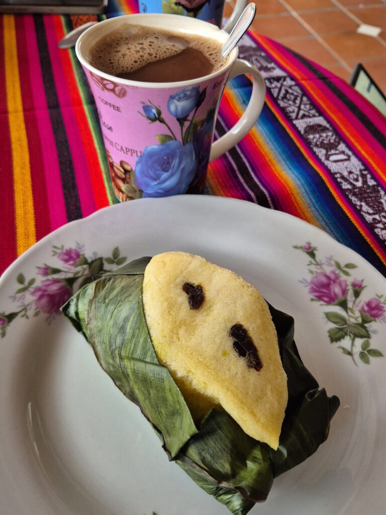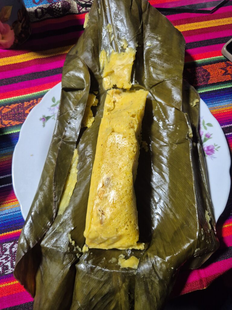 Loja est également célèbre pour ses tamales, une pâte de maïs cuite à l’étouffée dans une feuille de achira, fourrée de viande, œuf et quelques légumes. C’est une spécialité qu’on retrouve dans tous les pays andins mais de différente composition, taille et forme. On fait le plein pour le dîner et on prend des quimbolitos pour le dessert. Encore une fois, c’est une pâte cuite à la vapeur dans une feuille d’achira mais c’est aérien, un peu sucré, on dirait un bon cake moelleux, sur lequel ils ajoutent 2 « yeux » (raisins secs). Camille ne connaissait pas mais elle est conquise.
